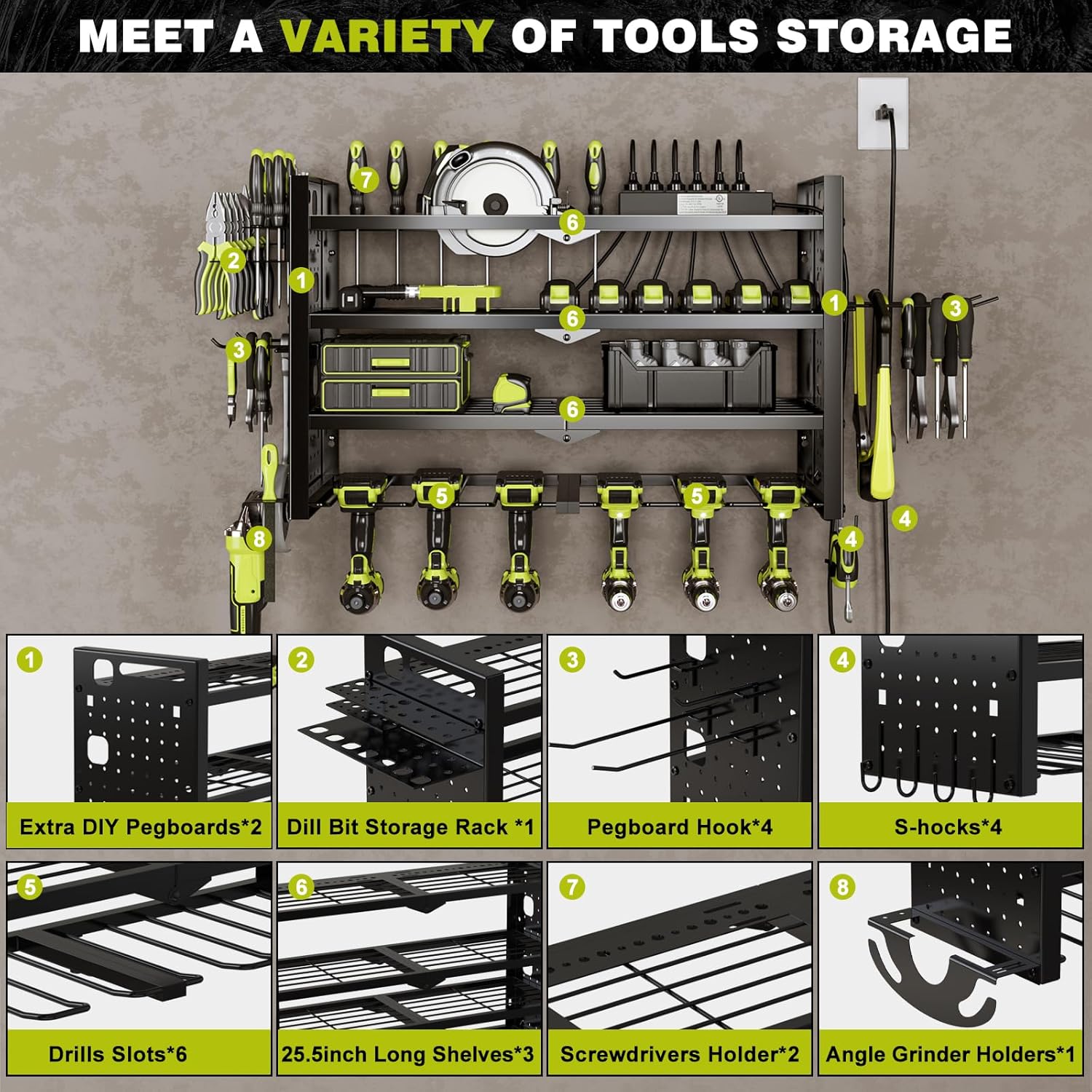 - Enhanced Storage Capacity:Perfect for garages and workshops, this 4-tier organizer neatly stores your tools and holds up to 6 drills on the bottom rack. Optimize your workspace for maximum efficiency