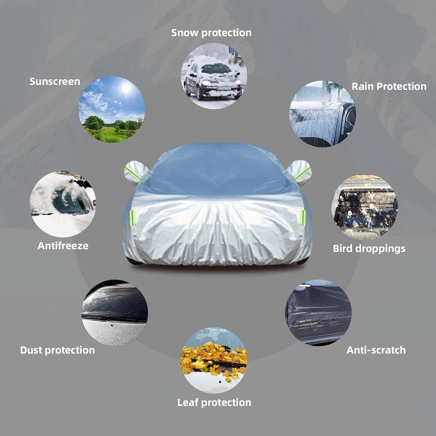 - All-Season Protection: Whether under the scorching sun or in frigid weather, our sedan car cover provides comprehensive protection across all four seasons. It guards against dust, snow, hail, industrial pollutants, bird droppings, leaves, pollen, acid rain, and intense sunlight, preserving your car's exterior in all conditions.