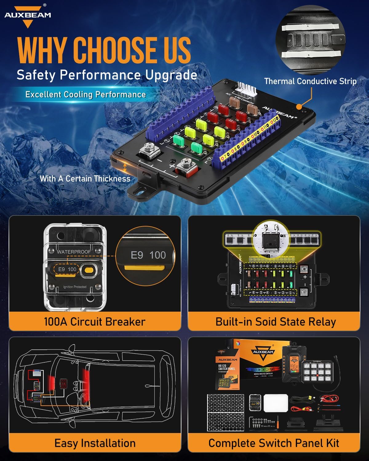 Auxbeam 12 Gang Switch Panel RB120 Toggle Momentary Pulsed RGB Dimmable Switch Panel Multifunction Two Sided Output Marine Control Panel IP65 Waterproof for Car Boat RV, 2 Years Warranty