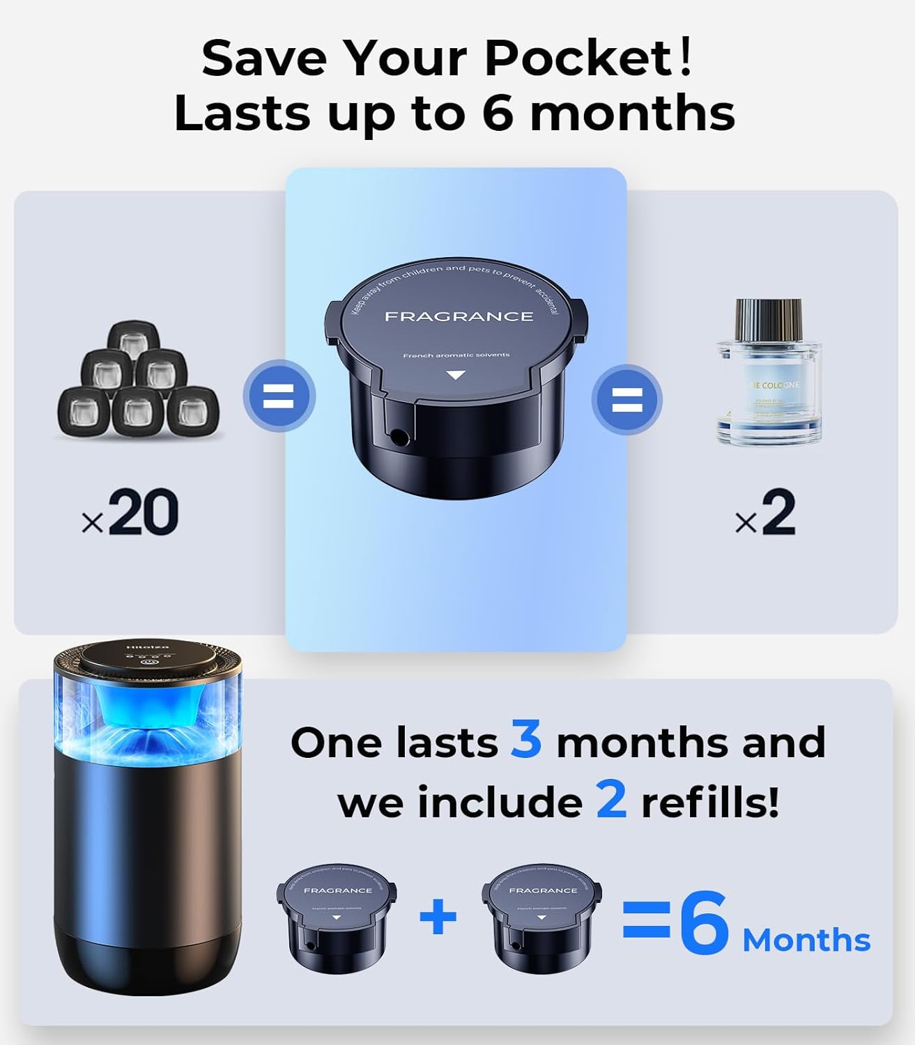- 【6 Months Long Lasting】Comes with two essential oil refills. The built-in counter allows each refill to spray up to 1,200 times. If you drive 10 hours per week, the two refills can last up to 6 months. Currently available in six scents and still being updated