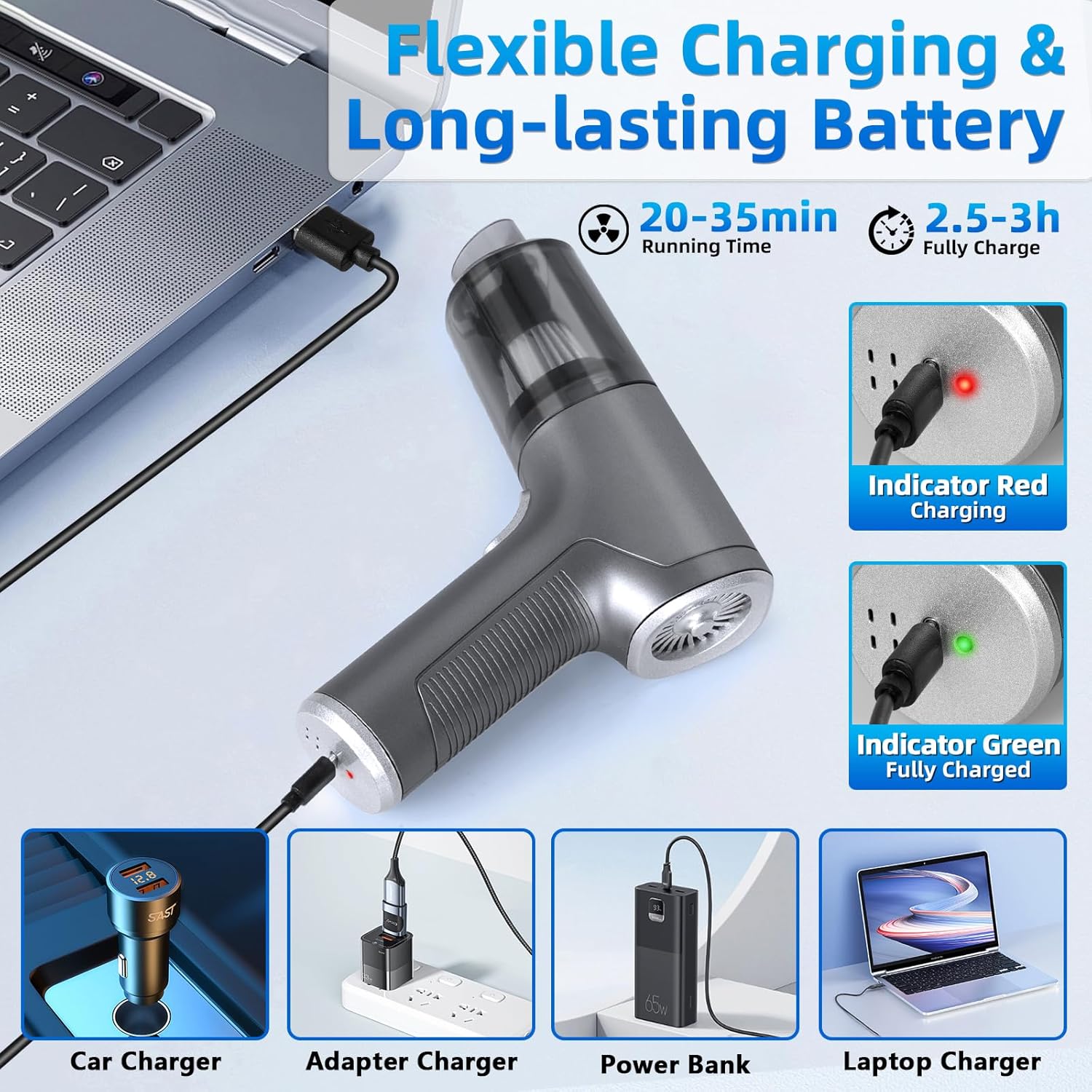 - 【Rechargeable Battery and Portable】 This mini car vacuum cleaner features a built-in 2*2000mAh battery and a Type-C fast charging cable, allowing full charge in just 2.5h~3 hours for 4-in-1 functionality. The Type-C port makes recharging easy with car chargers, power banks, or laptops. Weighing only 540g, it’s lightweight and portable, taking up minimal space.