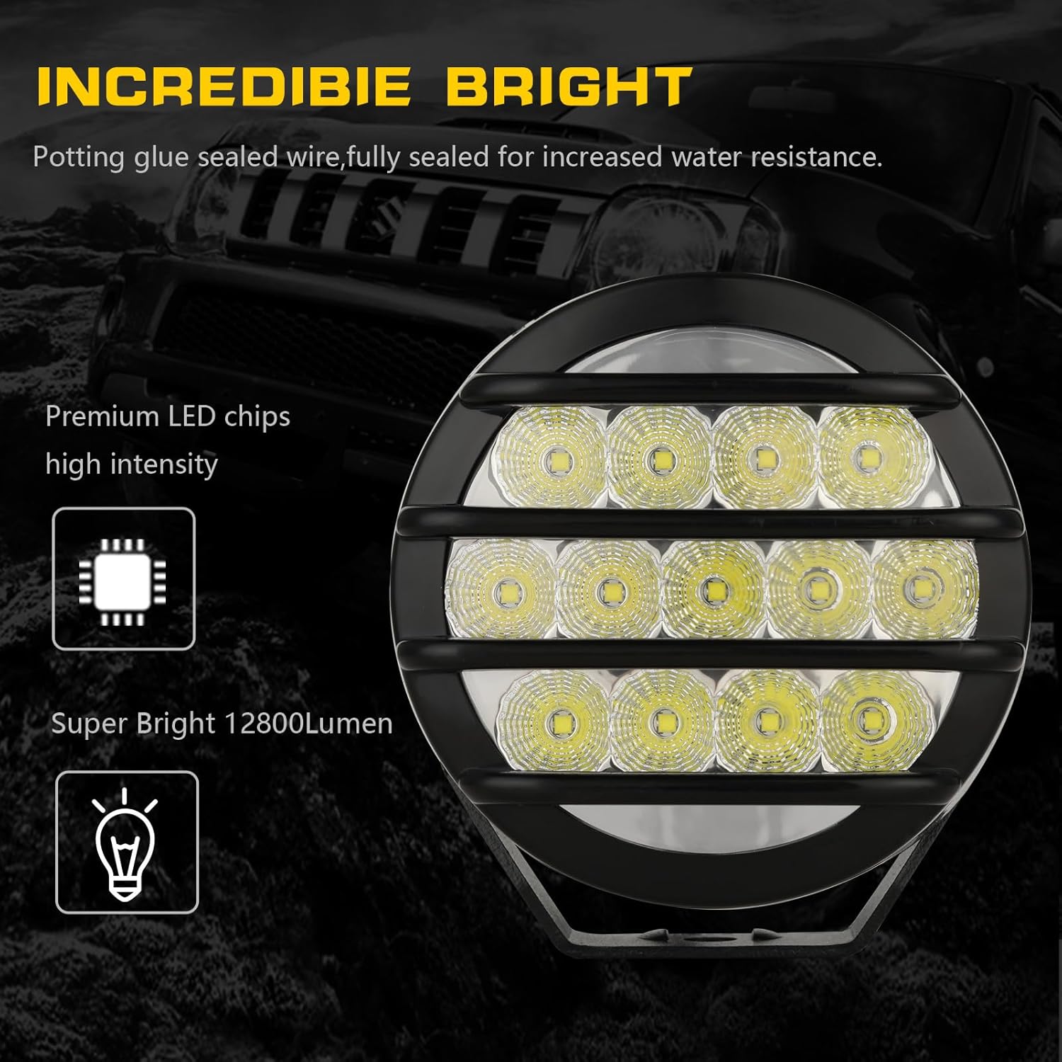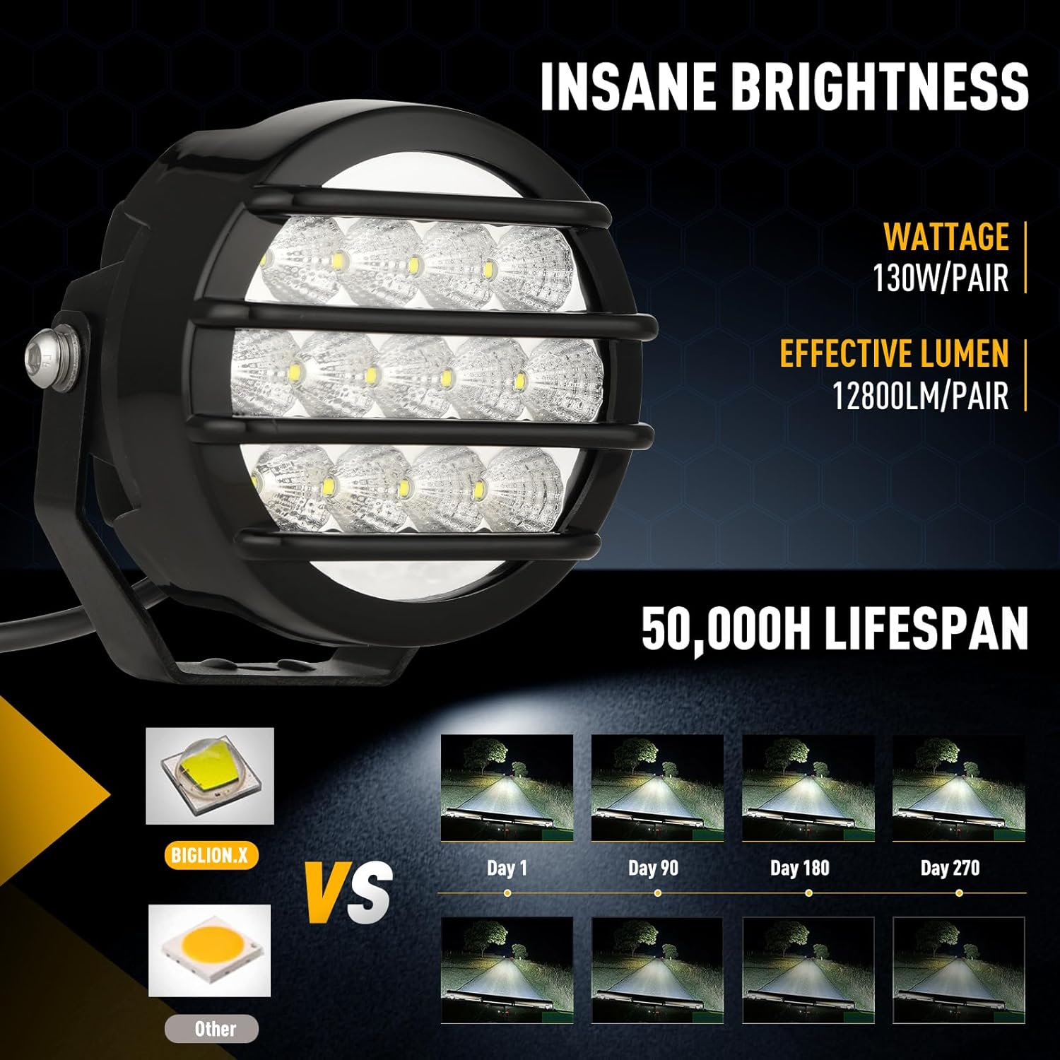 - 【Effective and stable electrical performance】Operating voltage range between 9V~32V. Pair 26pcs 12800 lumens high intensity led chips. Offroad led lights use premium high temperature resistance electronics elements to form high usage circuit, include IC, capacitance and inductance etc. reduce heat generation to make the light bar’s lifespan more than 50,000 hours. Meet EMC anti-interference standard. Round offroad lights can work normally between -40 °C ~ 150°C