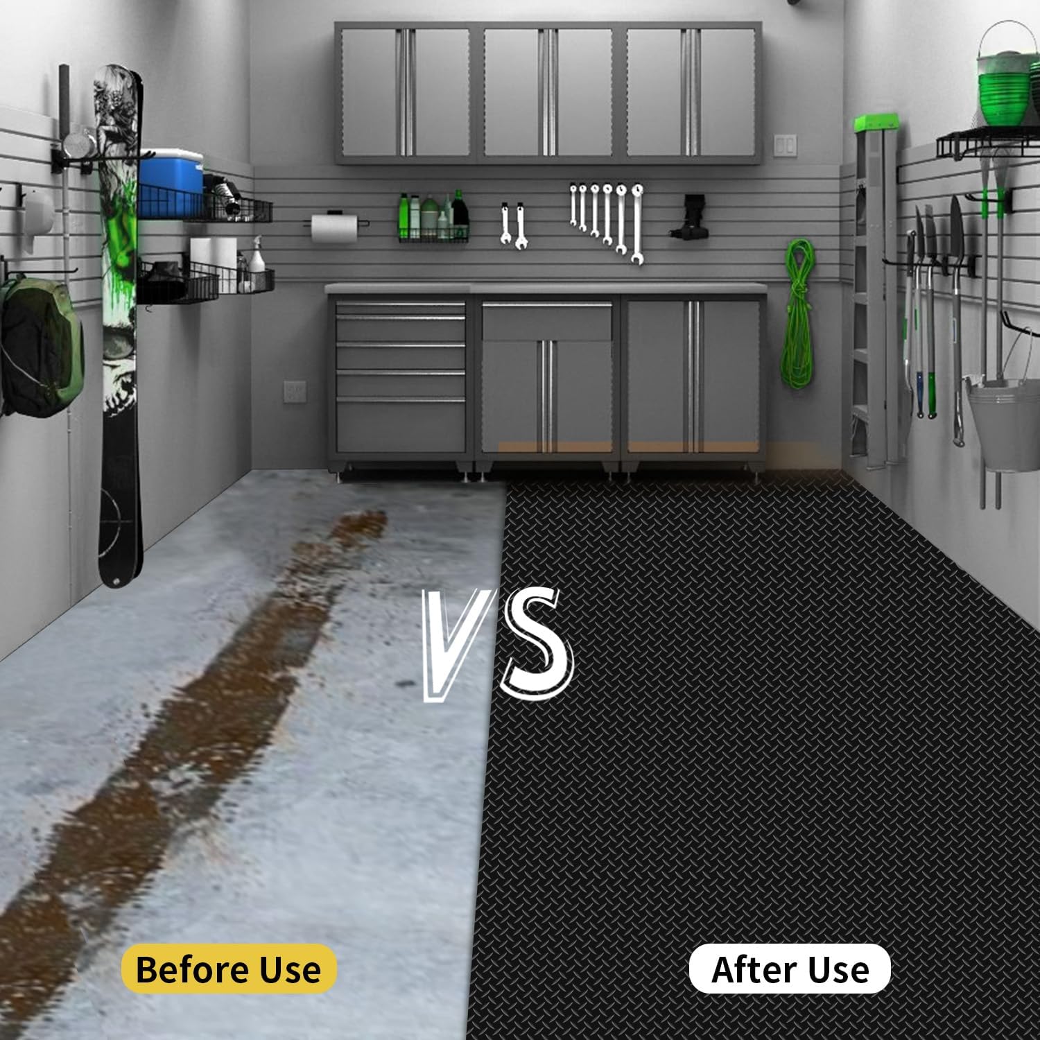 - DURABLE & SLIP-RESISTANT: Upgrade 2.0MM Sturdy Thicker PVC Material. Garage floor mats are with embossed diamond plate patterns which are totally anti-slip for safe in/out, greatly increasing the traction.