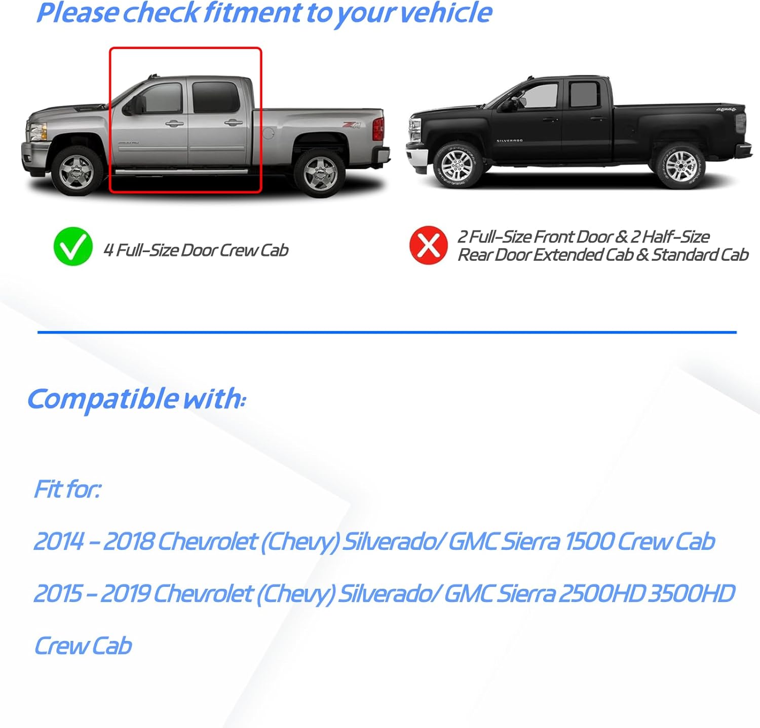 - 【Vehicles Fitments】 CUSTOM Fit for For 14-18 Chevy Silverado 1500 Crew Cab; 15-19 Chevy Silverado 2500 3500 Crew Cab; 14-18 GMC Sierra 1500 Crew Cab; 15-19 GMC Sierra 2500 3500 Crew Cab (ONLY For 4 FULL-SIZE Doors)