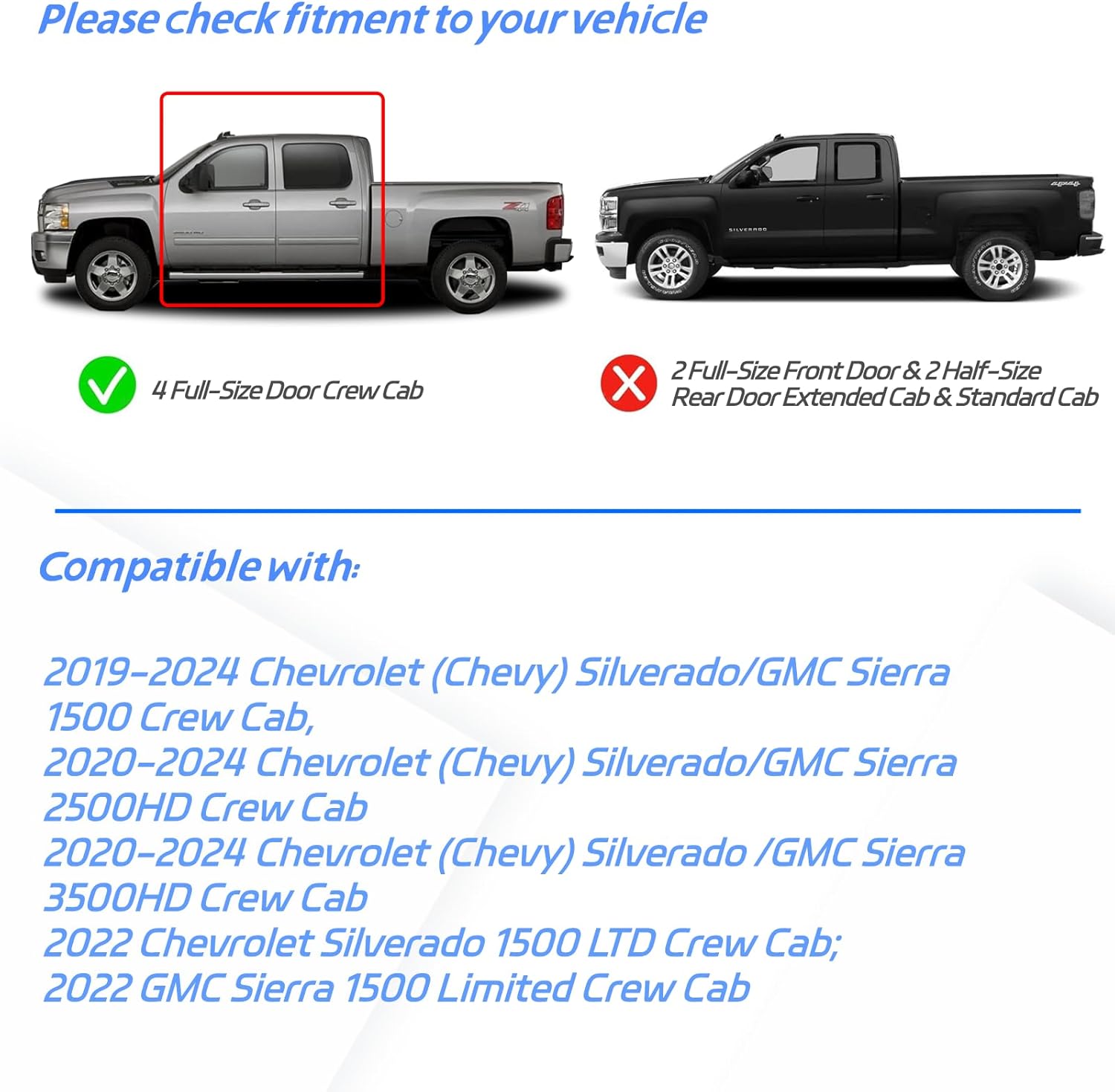 - : Vehicle Service Type Fit for 2019-2025 Chevrolet Silverado 1500 Crew Cab; 2020-2025 Chevrolet Silverado 2500 HD Crew Cab; 2020-2025 Chevrolet Silverado 3500 HD Crew Cab; 2019-2025 GMC Sierra 1500 Crew Cab; 2020-2025 GMC Sierra 2500 HD Crew Cab; 2020-2025 GMC Sierra 3500 HD Crew Cab; 2022 Chevrolet Silverado 1500 LTD Crew Cab; 2022 GMC Sierra 1500 Limited Crew Cab (ONLY for 4 FULL-SIZE Doors) Fit for 2019-2025 Chevrolet Silverado 1500 Crew Cab; 2020-2025 Chevrolet Silverado 2500… See more