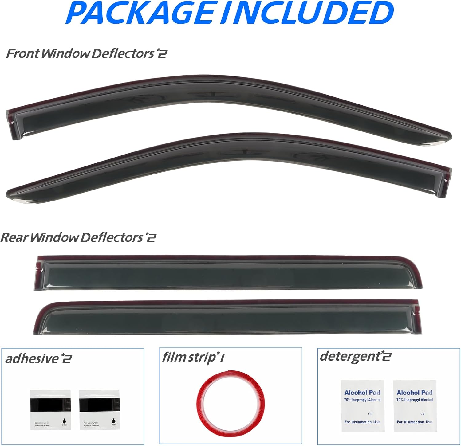 - Package Included: 4 pcs Vent Guards Shade Window Visors set - 2 pcs rear & 2 pcs front Vent Guards Visors, 2 pcs alcohol pad, 2 pcs adhesion promoter, a manual