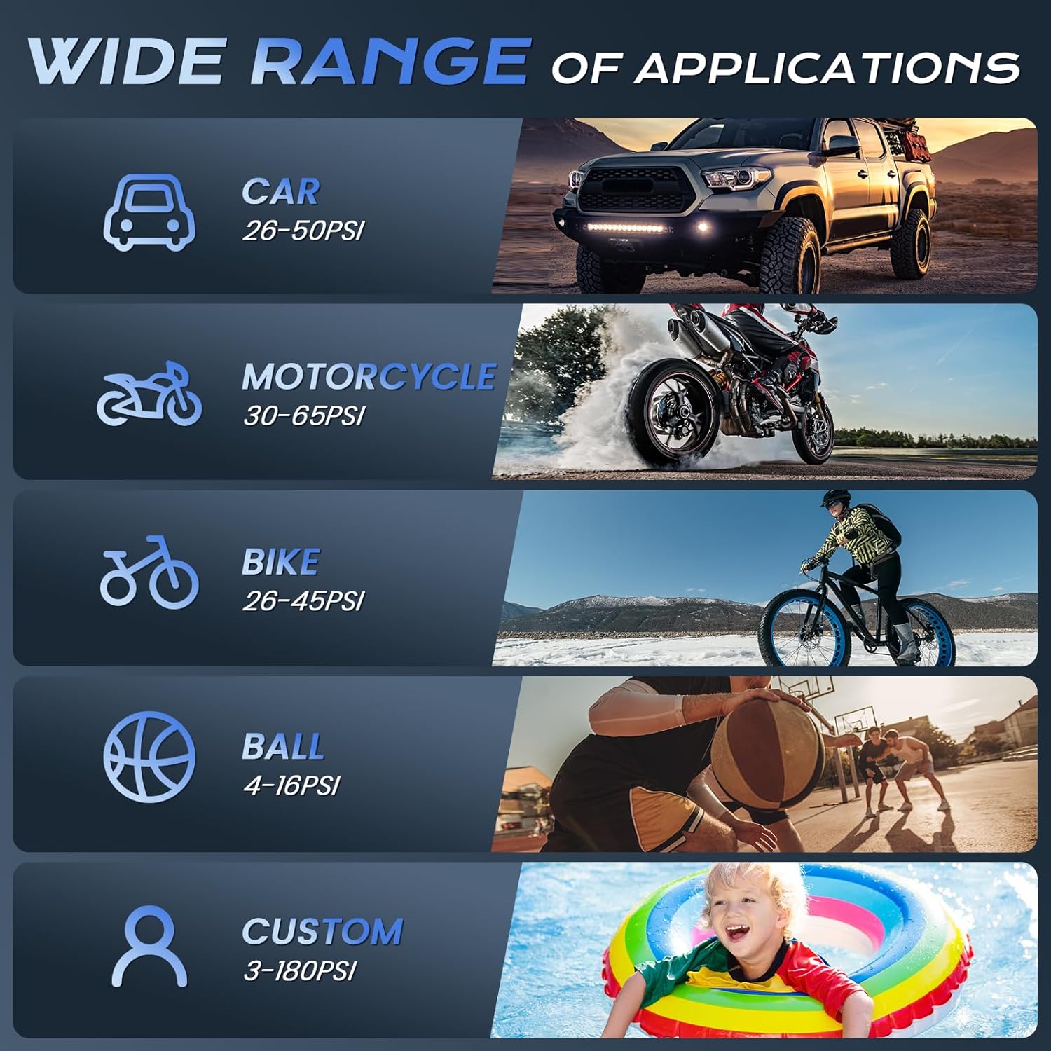 - ➤𝟏𝟖𝟎 𝐏𝐒𝐈, 𝟓𝐗 𝐅𝐚𝐬𝐭 𝐈𝐧𝐟𝐥𝐚𝐭𝐢𝐨𝐧 𝐒𝐩𝐞𝐞𝐝: The AIPOWAY air compressor portable provides a maximum pressure of 180 PSI and an air flow of 32 L/min. It can fully inflate car tyres in 6-9 minutes, motorcycle tyres in 2 minutes, bicycle tyres in 65 seconds and various balls in 50 seconds. You only need to switch to the appropriate inflation mode, and, after inflation is complete, it automatically stops to prevent over inflating.