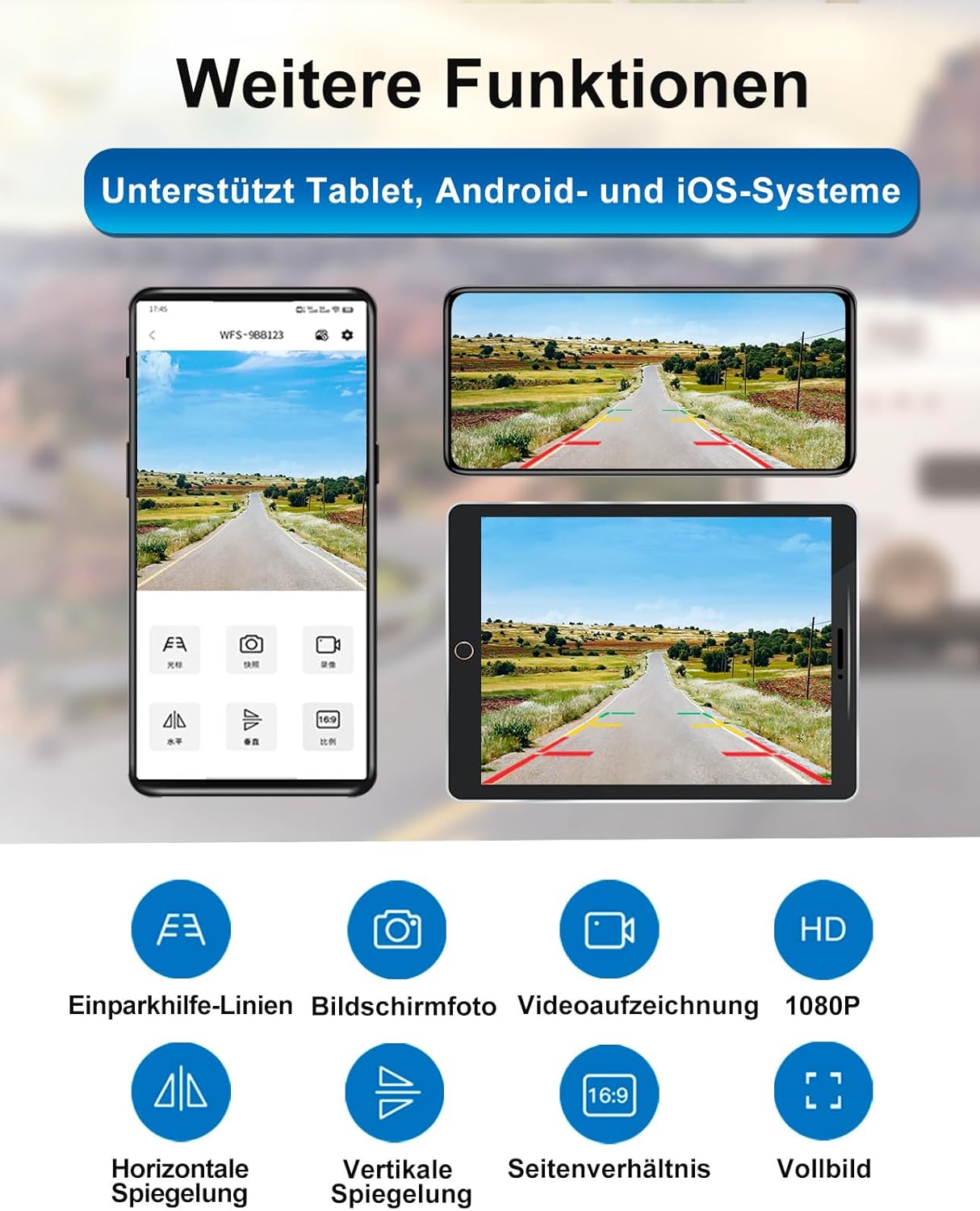 - 【Stable WiFi Connectivity-197FT】Enjoy a stable WiFi connection up to 197 feet (60 meters) in open areas, ideal for vehicles up to 30 feet long. The robust connectivity ensures smooth, real-time monitoring, enhancing safety and convenience on the road