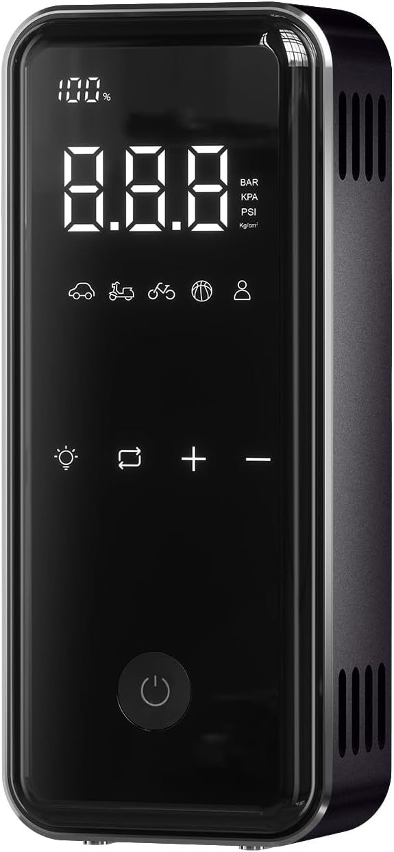 - Full Screen Touch Panel: The sleek, full-screen touch interface ensures easy operation, even in low-light conditions. Its stylish design and intuitive controls make this portable tire inflator a perfect addition to your car emergency kit.Powerful 65W PD&QC 3.0 output inflator boasts 5 times faster charge speed than portable tire inflators and 4 times faster than average portable chargers.