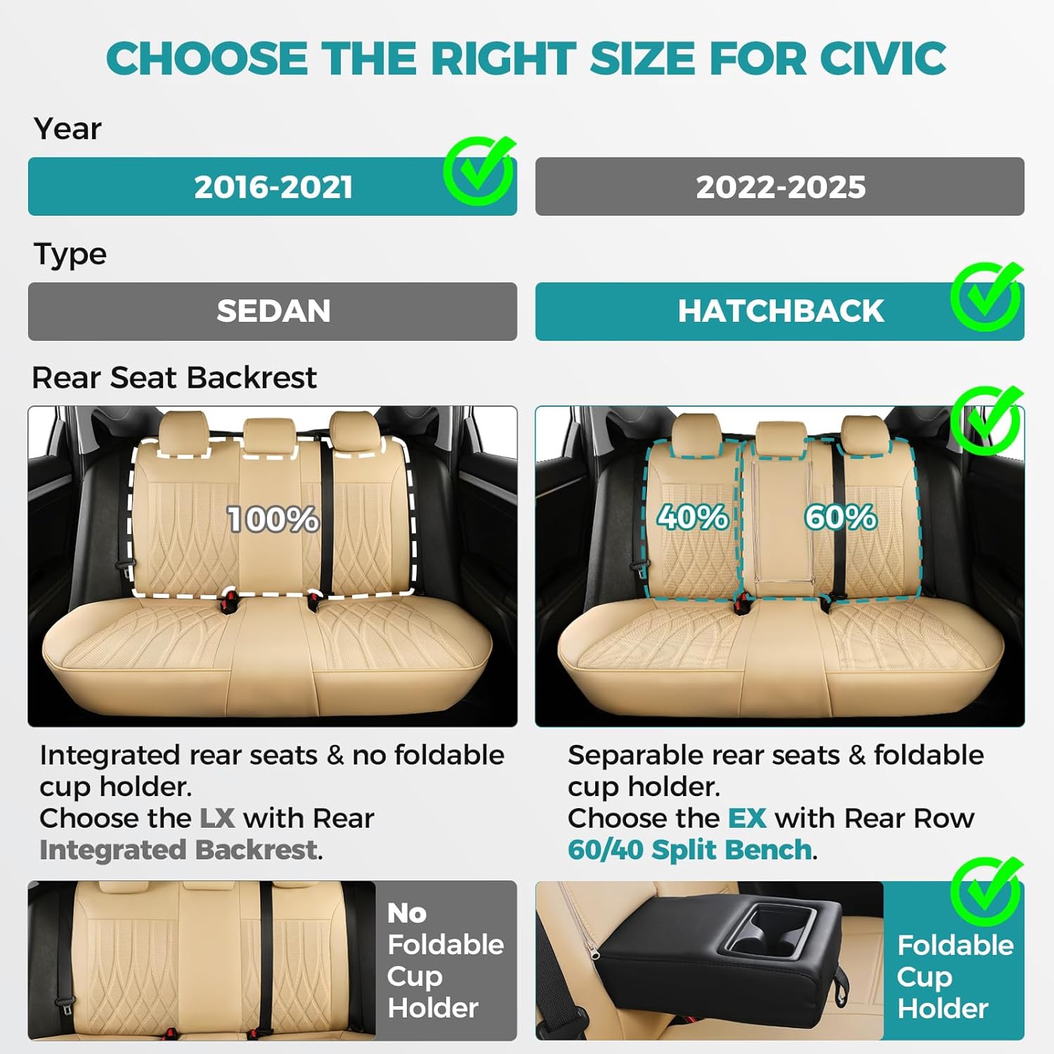 Seat Covers for Honda Civic Hatchback EX, Sport Touring, EXL 2016 2017 2018 2019 2020 2021, Faux Leather Car Seats Cover Full Set(Rear Row 40/60 Split & Folding Backrest)-Beige