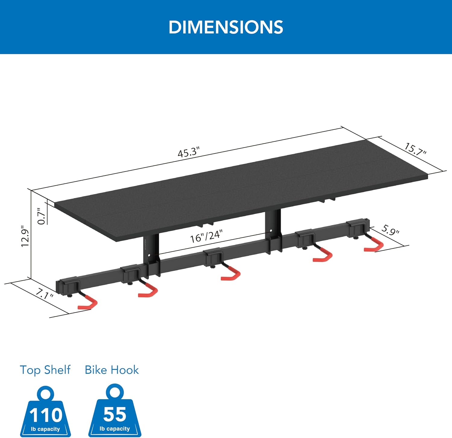 - HEAVY-DUTY GARAGE BIKE STORAGE – Built with high-quality steel and a 110 lb capacity shelf, each bike hook supports up to 55 lbs, making it ideal for securely holding all types of bikes and equipment in your garage.