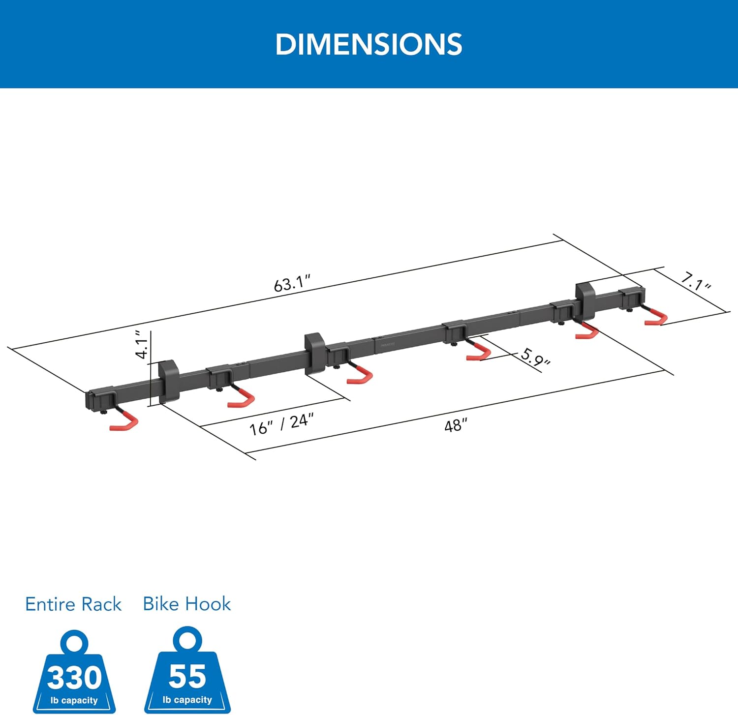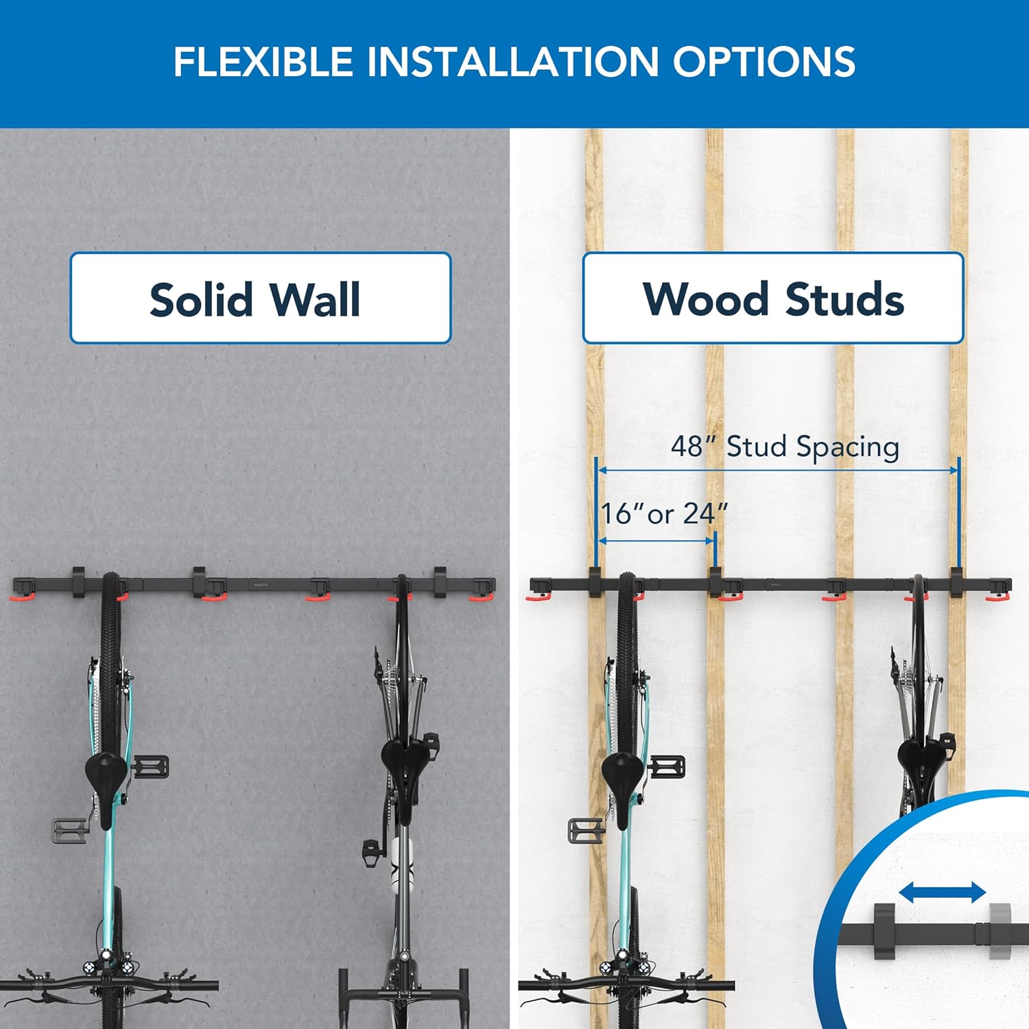- ADJUSTABLE HOOKS FOR VERSATILE STORAGE – Customize the spacing to fit a variety of bike types. Each hook can move left or right, allowing perfect positioning for road, mountain, hybrid, and kid bikes.