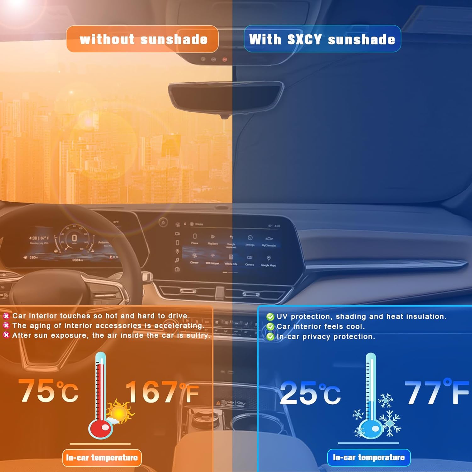 - 2.Sun Protection: Solve your concerns about parking for a long time under the scorching sun,prevent the car's interior from getting sunburned and extend your car interior accessories’life.