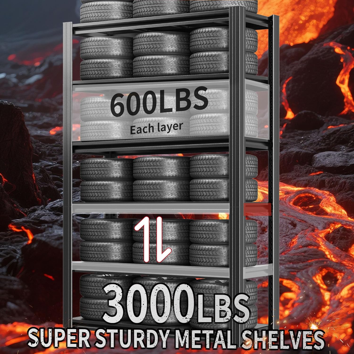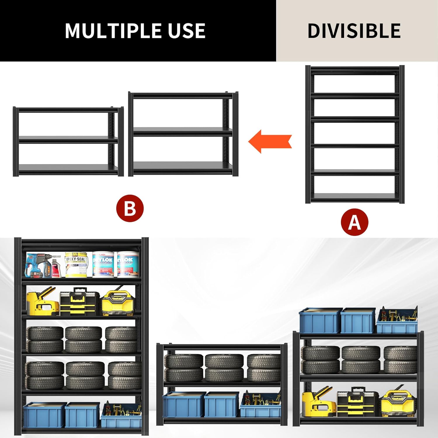 - 【Heavy-Duty Capacity】Our industrial garage shelving unit boasts a robust 2,500 lbs capacity, with each shelf supporting up to 500 lbs. Constructed from high-quality metal with reinforced double-layer legs, these multi-purpose garage storage shelves are designed to handle the toughest loads, making them ideal for garages, warehouses, and workshops.
