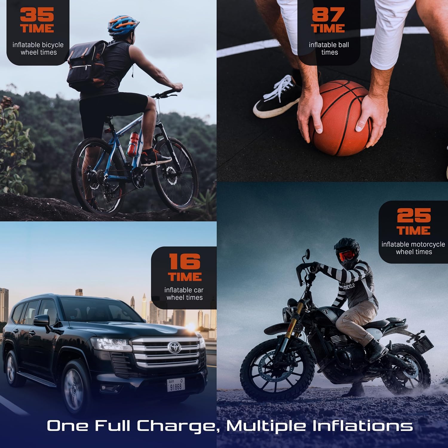 - High-Pressure, Multi-Functional Air Compressor – With up to 150 PSI, this portable air compressor can handle inflating car tires, motorcycle tires, bicycle tires, sports balls, and even balloons. This compact yet powerful tire inflator is equipped with multiple nozzles to meet all your inflation needs, whether you’re on a road trip or at home. Suitable for car, bike, and air pump applications, including basketballs and footballs.