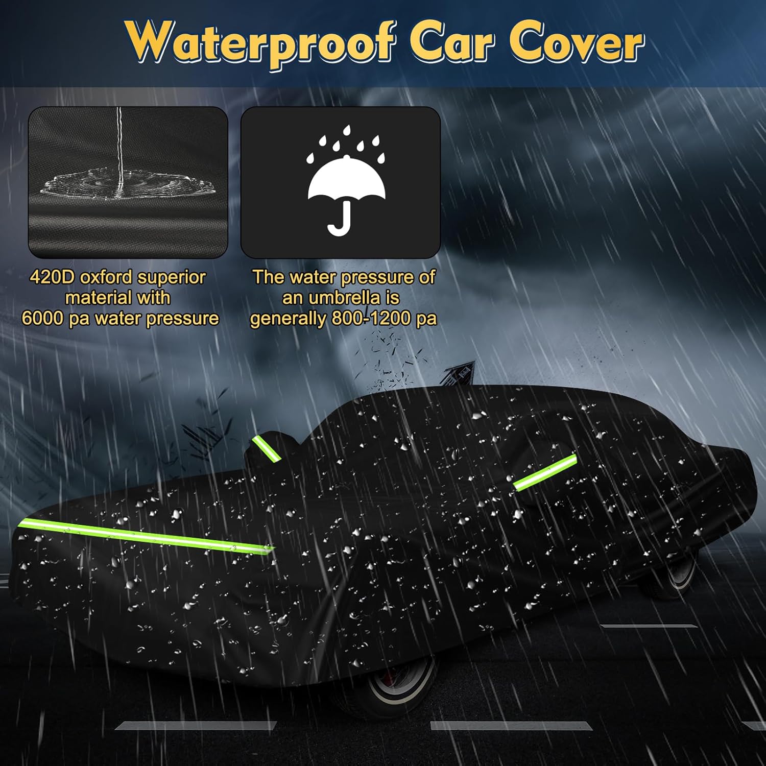 - 【All-Weather Protection】Made black 420D Oxford cloth and multi-layer waterproof fabric as material, ensuring its quality is tough, durable, and safe in strong wind conditions. Protects your vehicle and paint from rain, snow, sun, bird droppings, pollen, dust/dirt - suitable for all seasons.