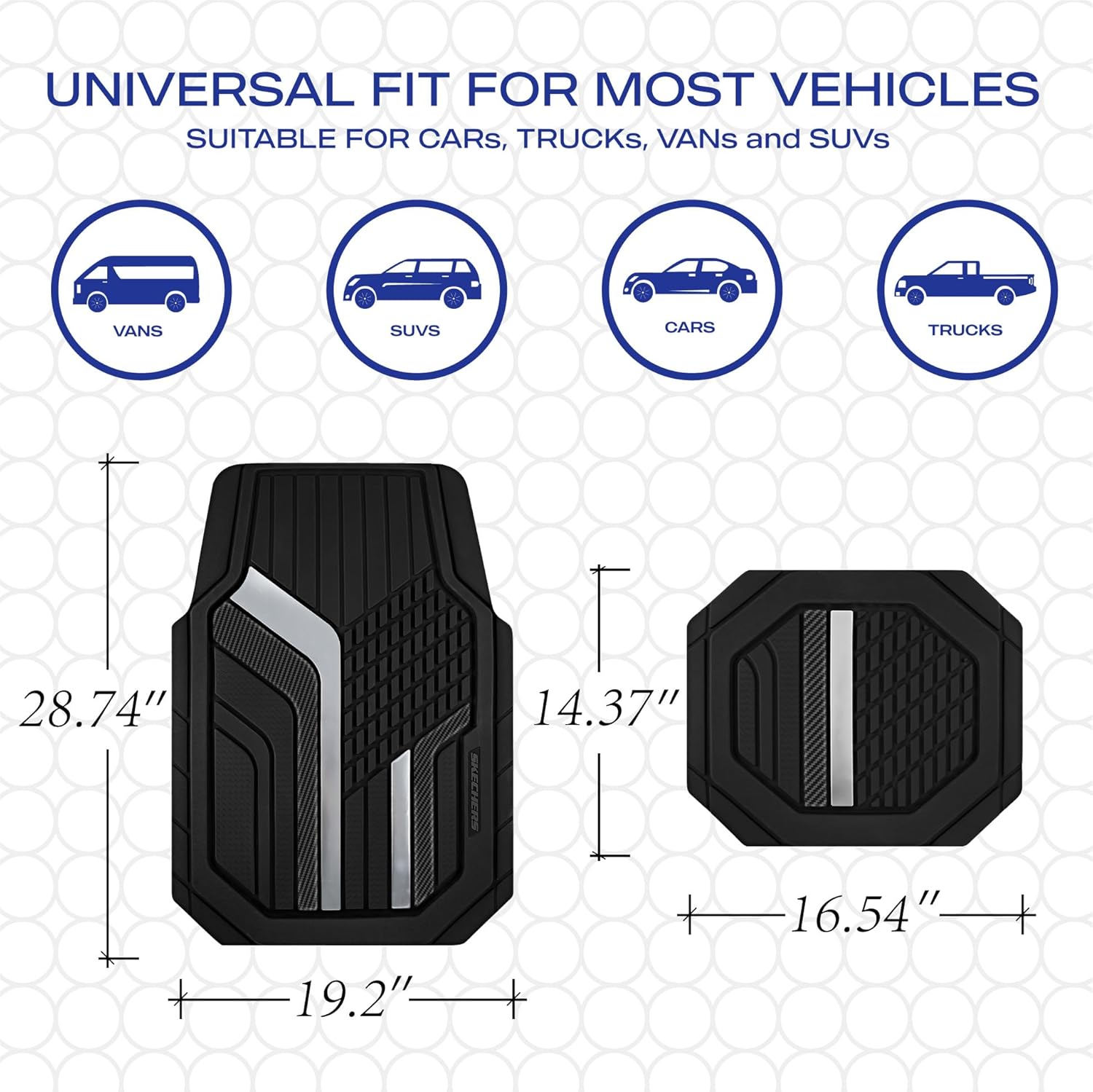 - TWO-TONE DESIGN-Engineered for quick and easy installation, Skechers Floor Mats are designed to fit most cars, trucks, pickups, and SUVs. Features a stylish two-tone color scheme that adds a modern and dynamic touch to your car interior, effortlessly blending elegance with functionality.