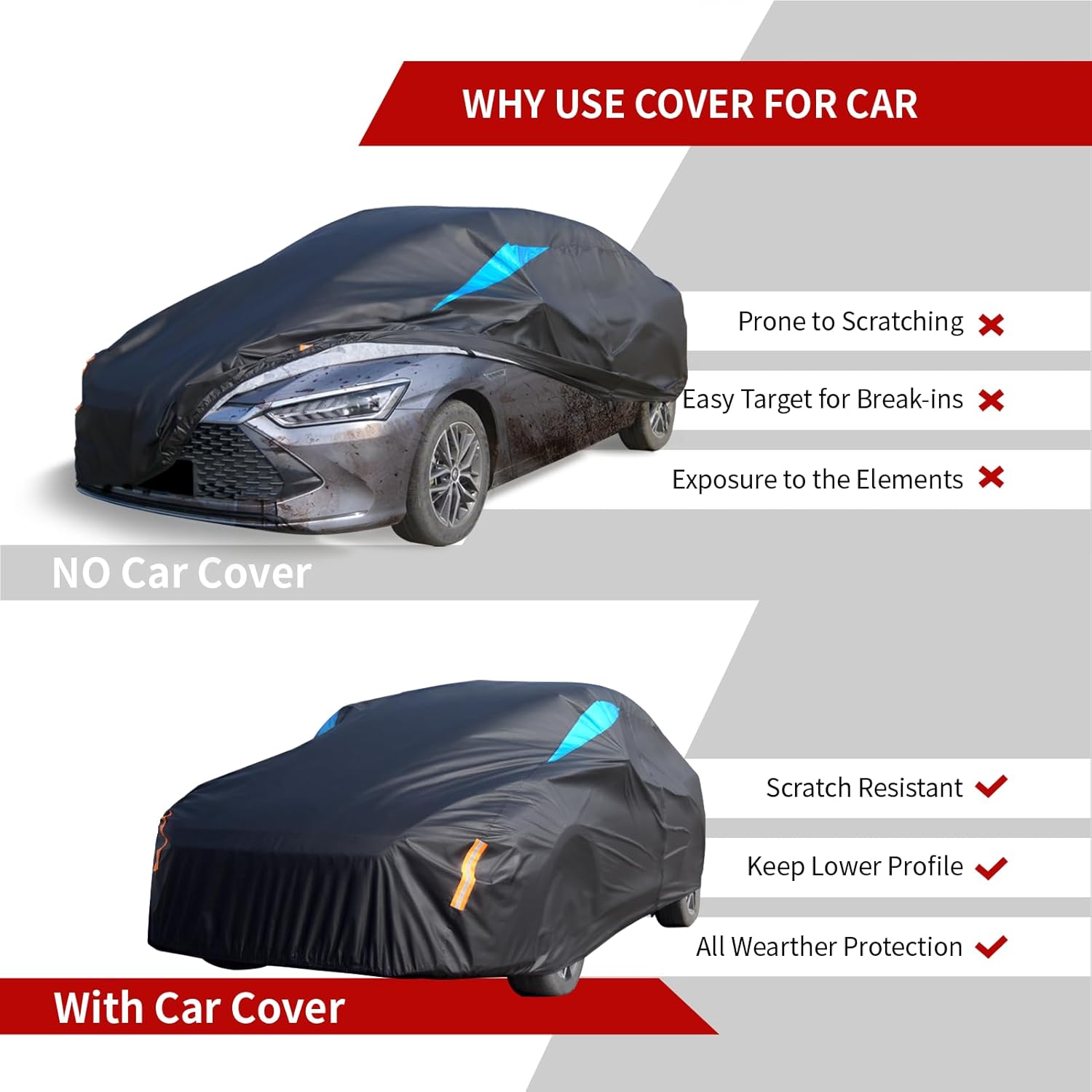 - Choose Fit Cover: The car cover waterproof all weather fits up to 196 inches for sedan. (NOT FOR HATCHBACK AND SUV ). As long as your car does not exceed the applicable length, it can be applied and protected. Please check your car details before you choose the car cover, select the car cover with the corresponding specifications
