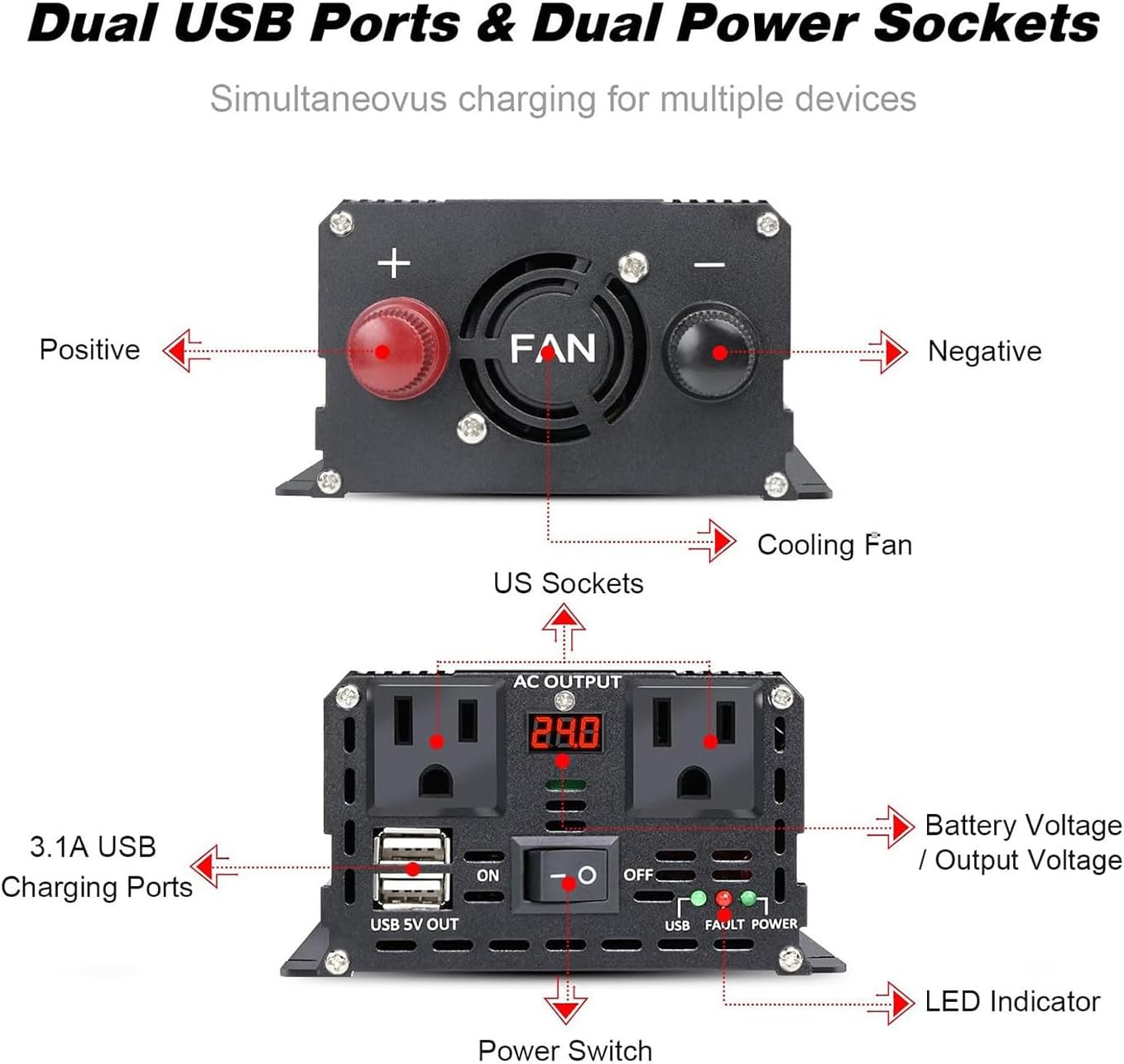 - HIGH QUALITY PURE SINE WAVE OUTPUT: LVYUAN Power Inverter provides continuous and stable 1000W pure sine wave power, 2000W peak power with 2 AC outlets, 2 USB ports, easy to power multiple devices at the same time.