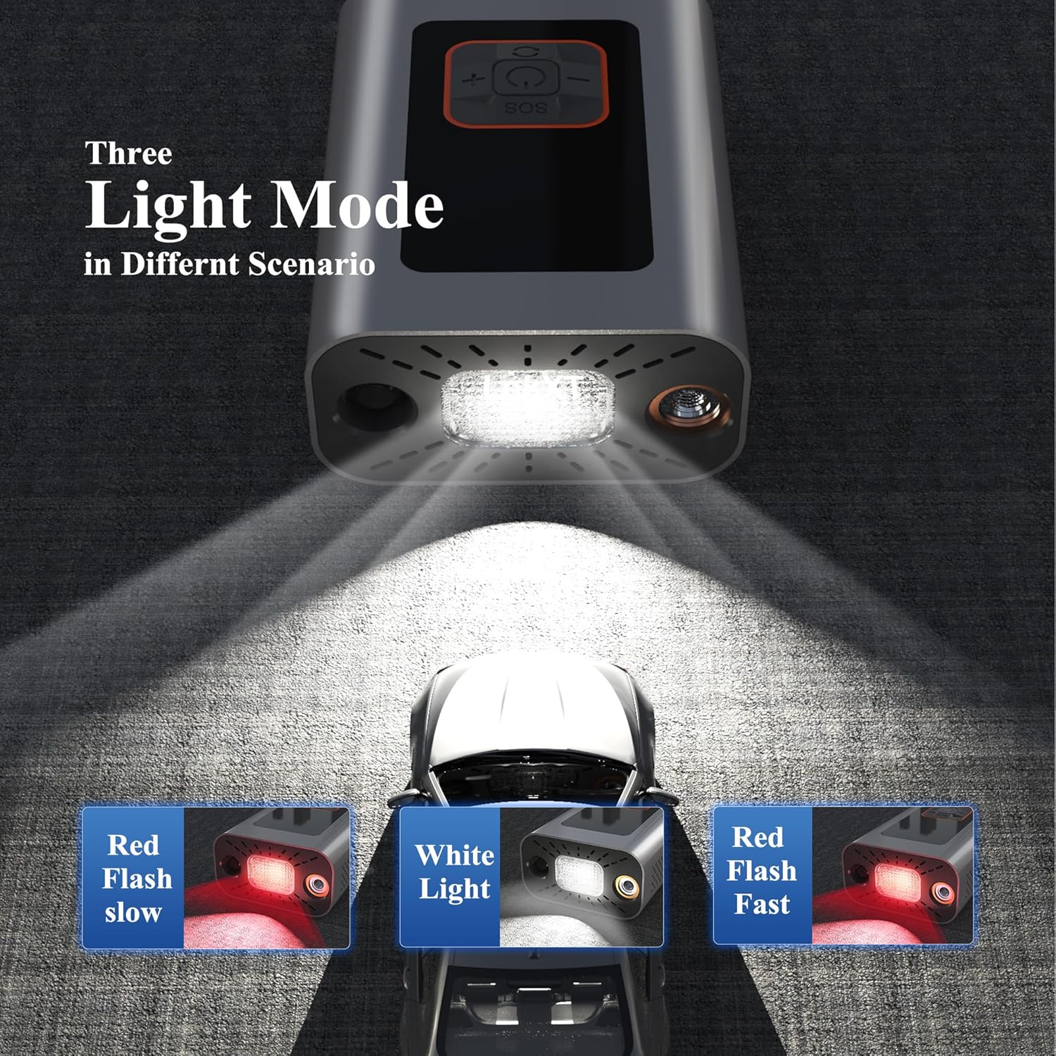 - Built-in LED Light with SOS Emergency Function – For added convenience and safety, this car tire pump includes a built-in LED light to illuminate your work area, especially useful during nighttime or low-light conditions. The LED also features an SOS flashing mode,with white light and red flash, providing a crucial safety feature in case of roadside emergencies or unexpected breakdowns. This dual functionality ensures you're well-prepared for any situation, day or night.
