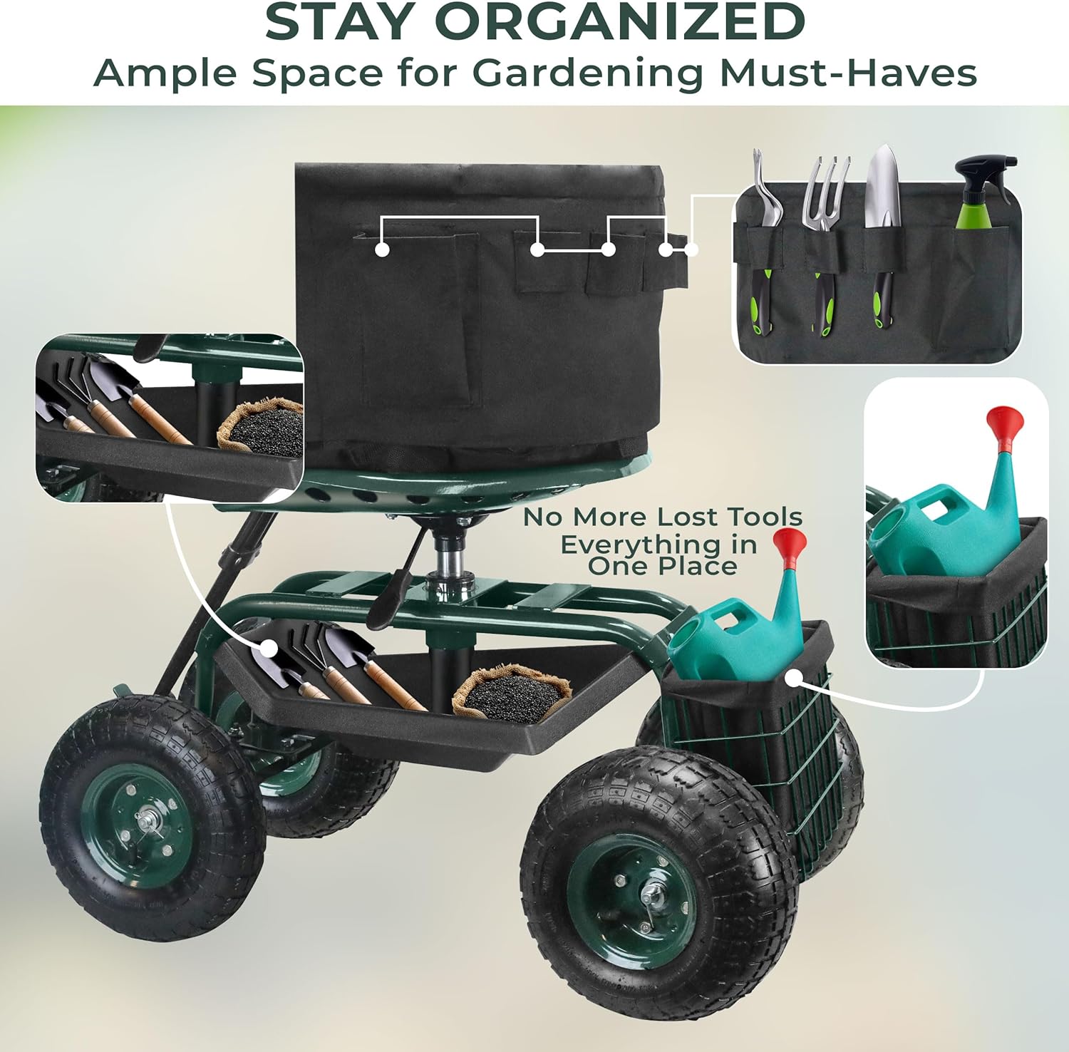 Garden Seat with Wheels – Adjustable 360° Swivel Gardening Stool with Hydraulic Height Adjustment, Ergonomic Backrest, and Tool Storage – Rolling Stool for Garden, Yard, and Outdoor Use