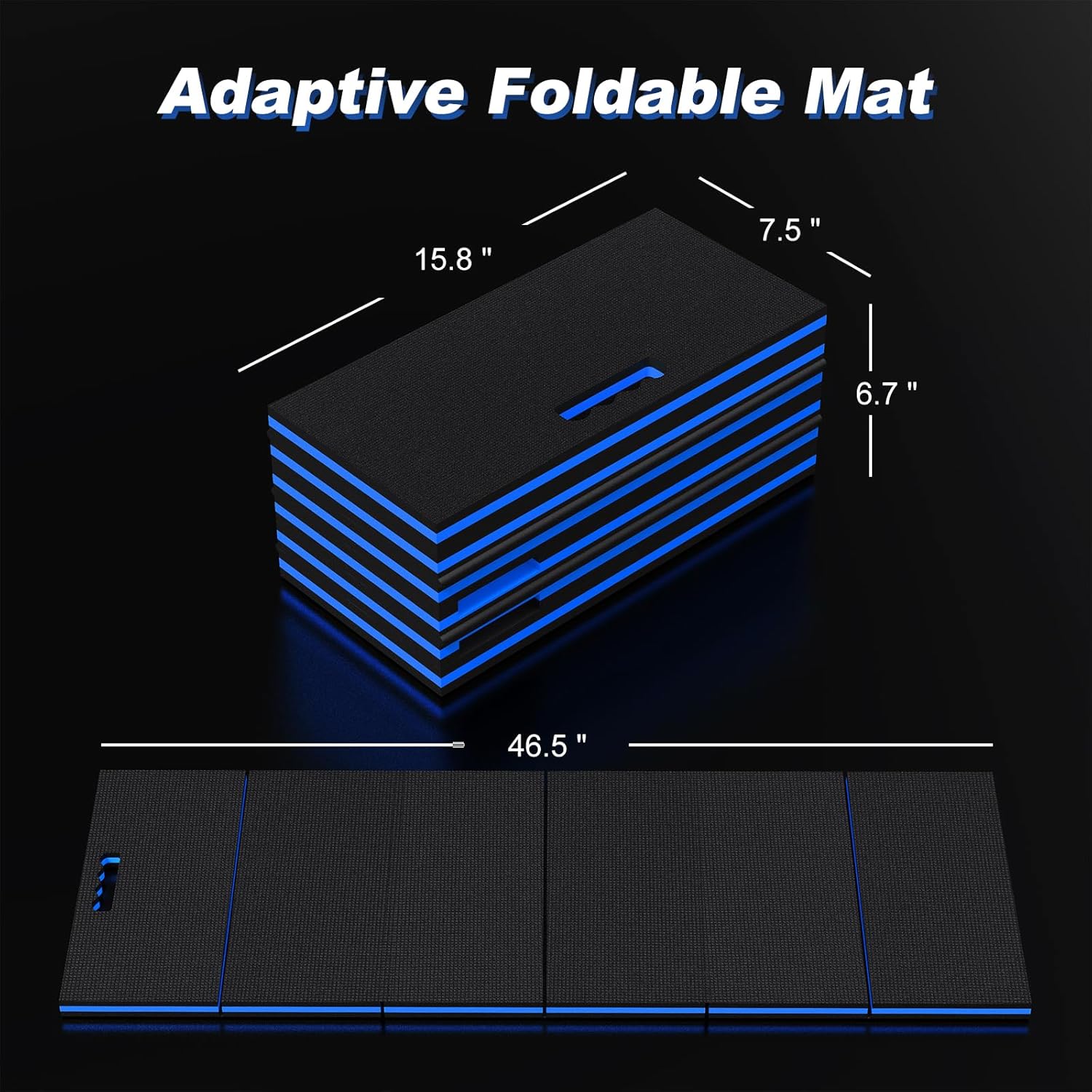 - Compact & Portable: Designed for easy transport, the mat folds down to a compact size of 15.8 x 7.9 x 6.7 inches and expands to 46.5 x 15.8 x 1.1 inches. With a built-in handle and securing strap, it’s easy to carry to the garage, campsite, or wherever your work takes you