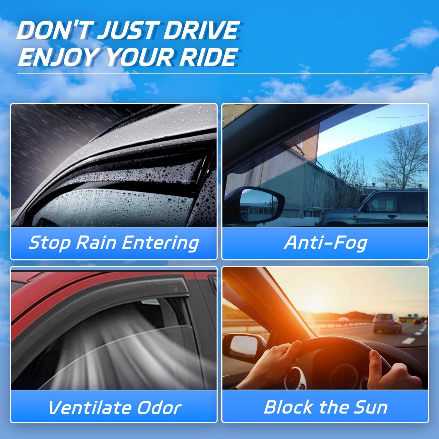 - Improve Driving Experience: Allows fresh air to circulate through open windows while keeping the rain out or reduces heat. Reduce mirror and window fogging; reduce sun glare through side window: reduce wind noise
