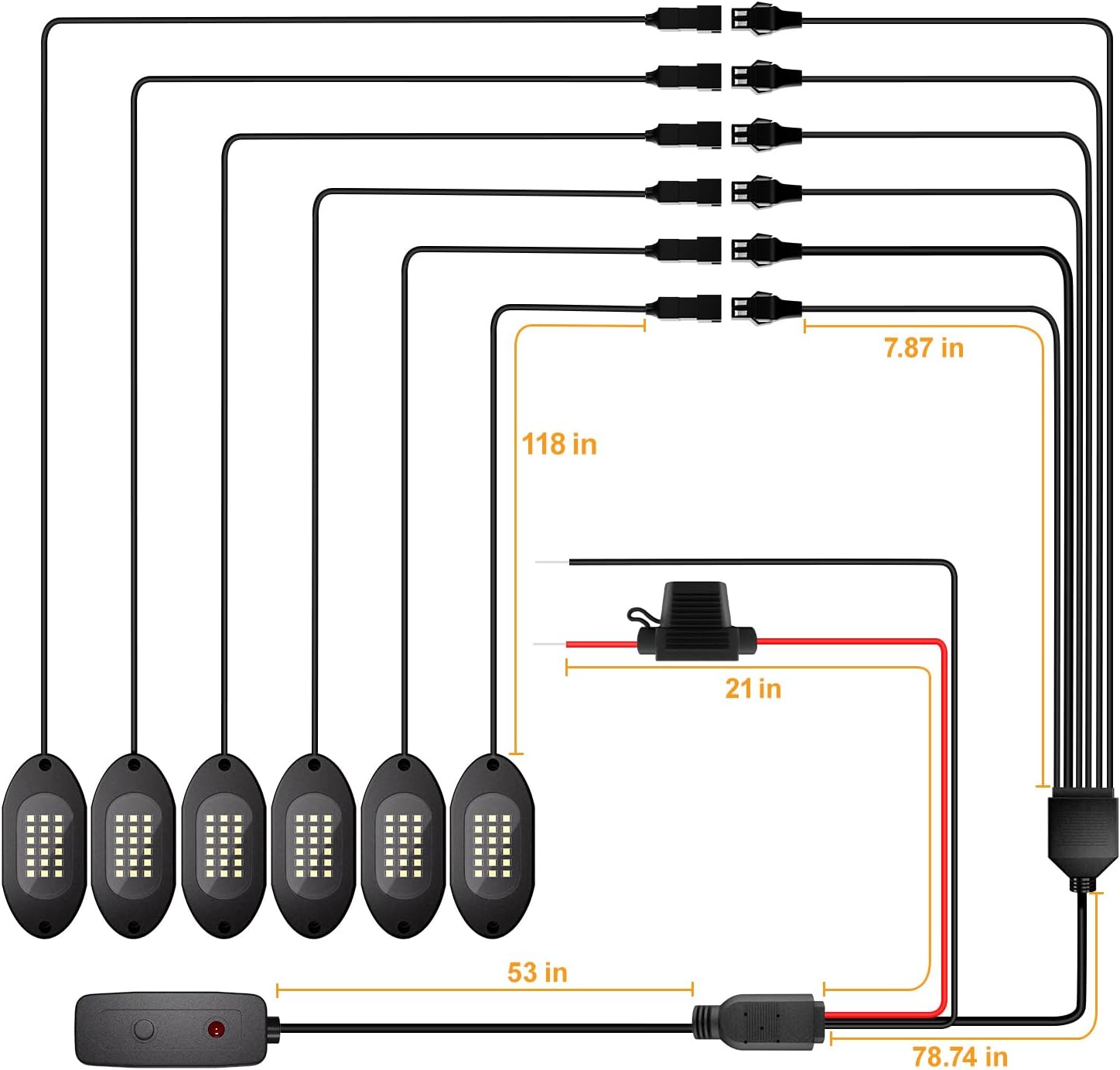 - 【Each Pod Wired is 118 inches】Each pod comes with a cable length of 118 inches. IIf you want to decorate a large vehicle, you may need to add additional extension cords. Please search for ASIN: B0DLSL74CC on Amazon to add more, this extension wire is plug and play, specifically compatible with Honalia white rock lights for trucks