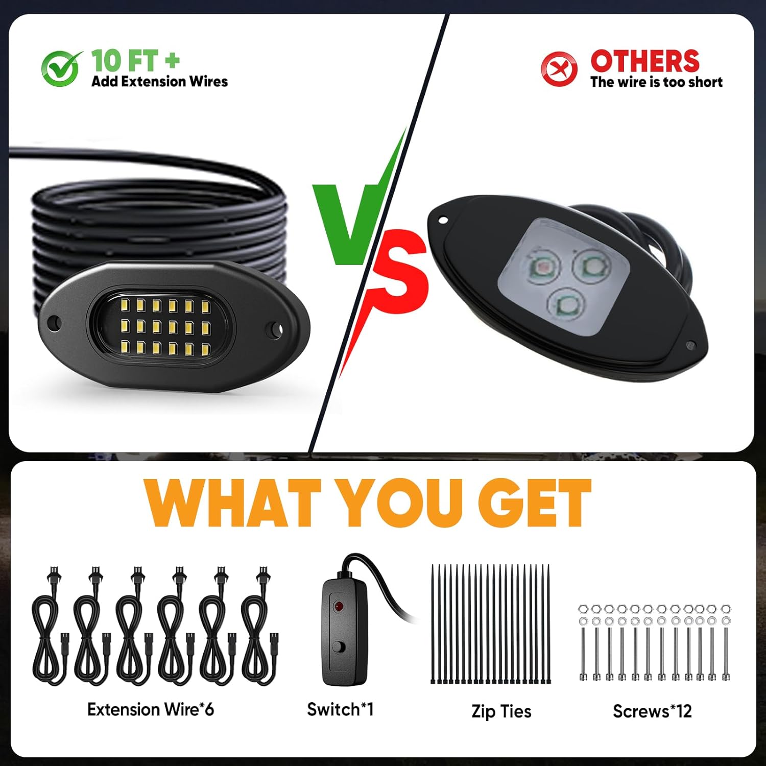 - Included Components : LED Rock Lights Kits, Switch, Blade Fuse, Zip Ties, Screws, Allen Wrench