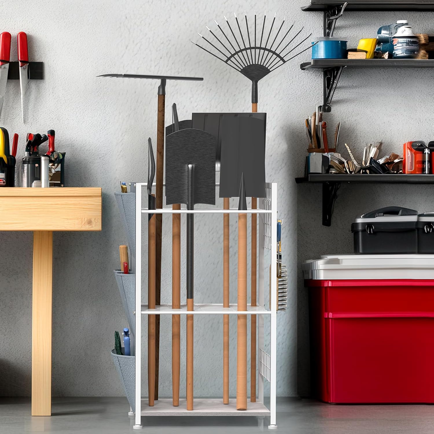 - Flexible three-layer storage shelf: The three-layer design combined with a top adjustable shelf allows for easy adaptation to different heights of gardening tools (shovels, leaf rakes to bow rakes, mops and brooms), potted plants or cleaning supplies. 5 hooks expand the hanging space, and the large-capacity side storage bag is specially designed for small items such as gloves and pruning tools, achieving three-dimensional classified storage and maximizing the use of vertical space in garages, sheds or balconies.