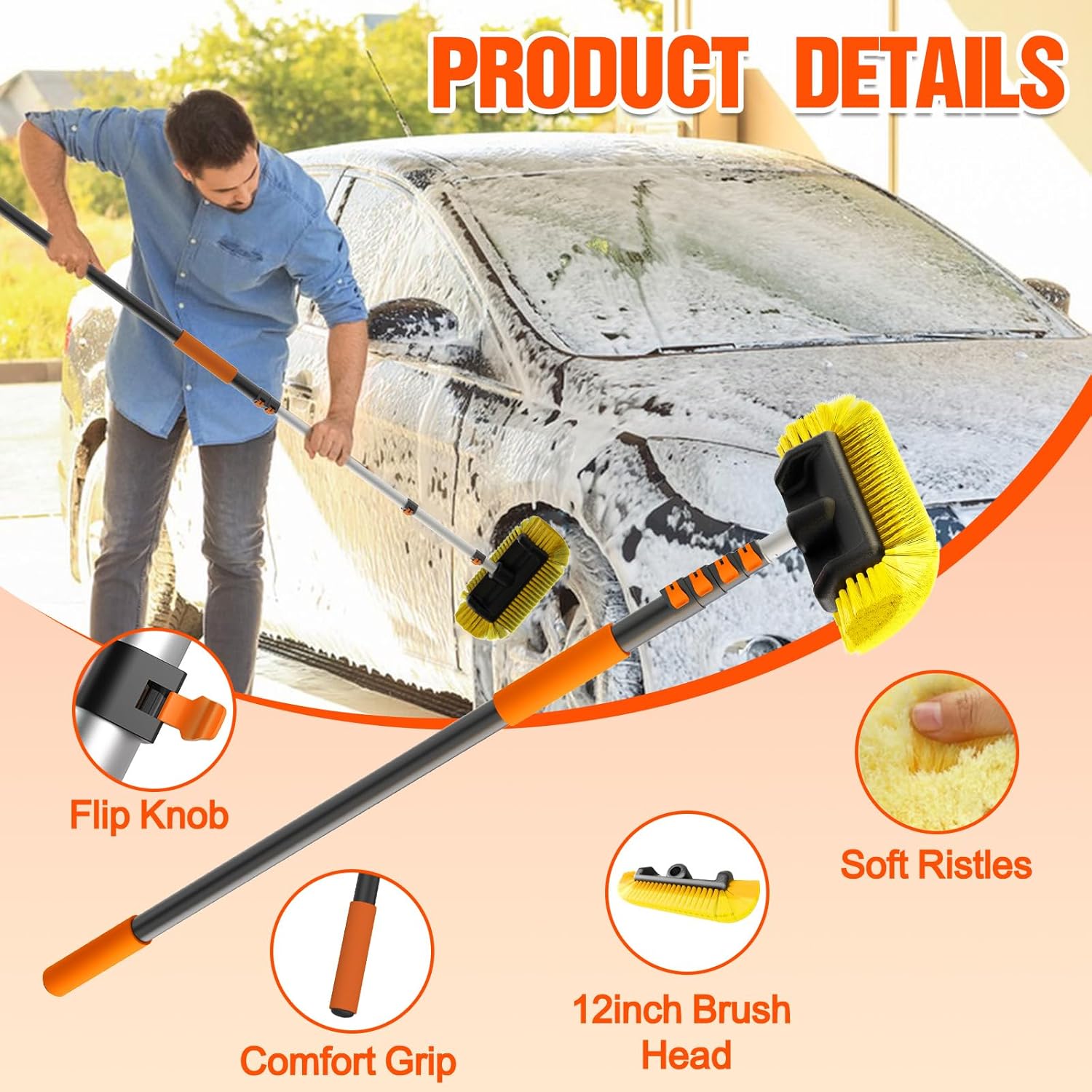 12FT Car Wash Brush with Long Handle, Car Cleaning Brush with 12 Inch Soft Bristle, Solar Panels Cleaner with Telescoping Pole for RV, Truck, Boat, House Siding