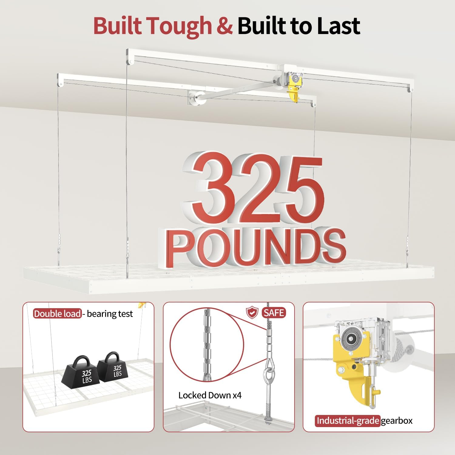 - Heavy-Duty and Versatile Use: Built from high-strength steel, the FERO garage ceiling shelving supports up to 325 lbs. It handles bikes, kayaks, toolboxes, and more, and can even be used as a jeep top hoist for garage—delivering long-lasting strength for various storage ideas for garage and garage storage needs.