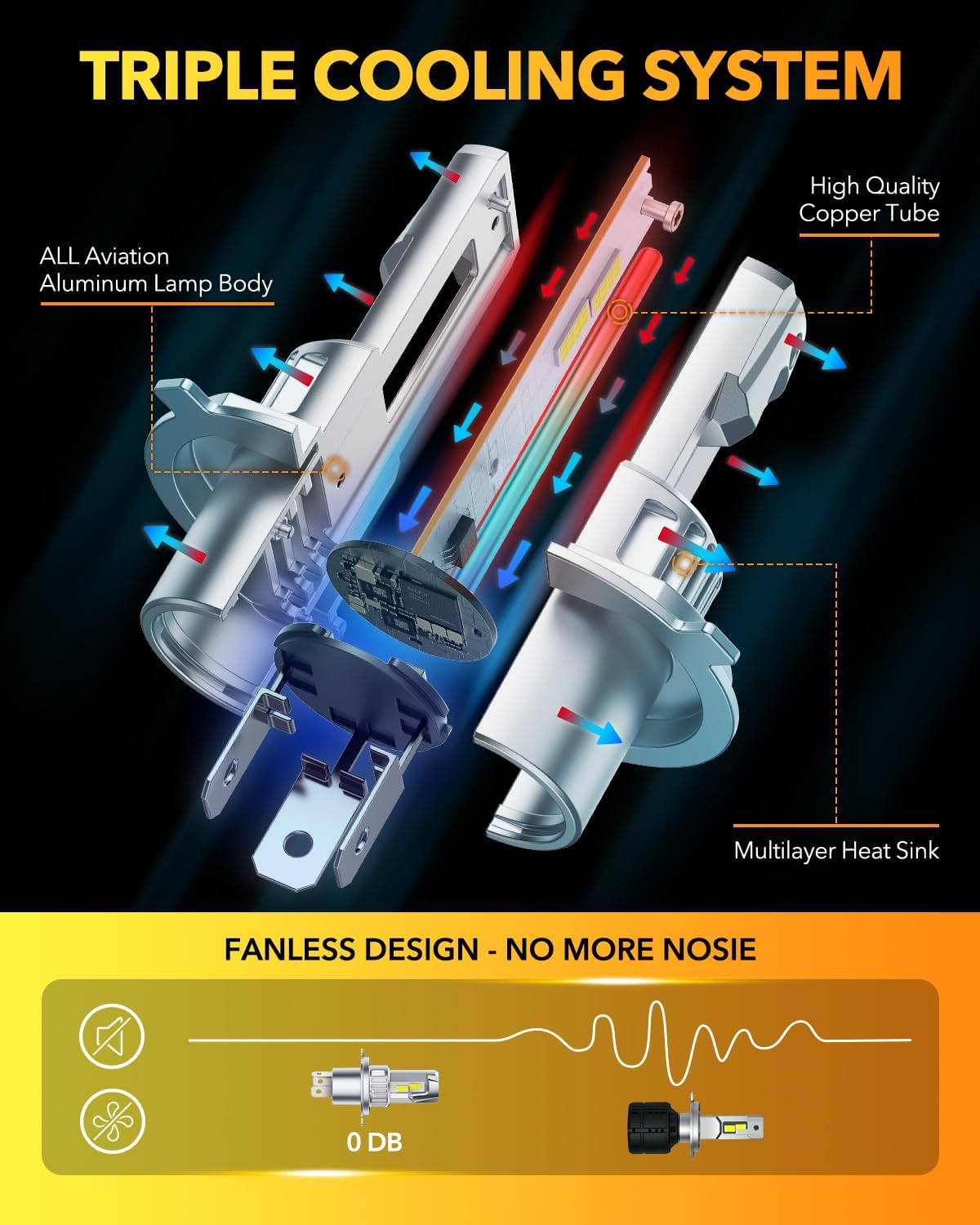 - 【Over 60,000-hours Lifespan】With built-in temp control chips, liquid-cooling copper tube, and aviation aluminum body, our H4 bulbs achieve 120% improved heat dissipation. This advanced design extends the lifespan to over 60,000 hours, minimizing the need for frequent replacements.