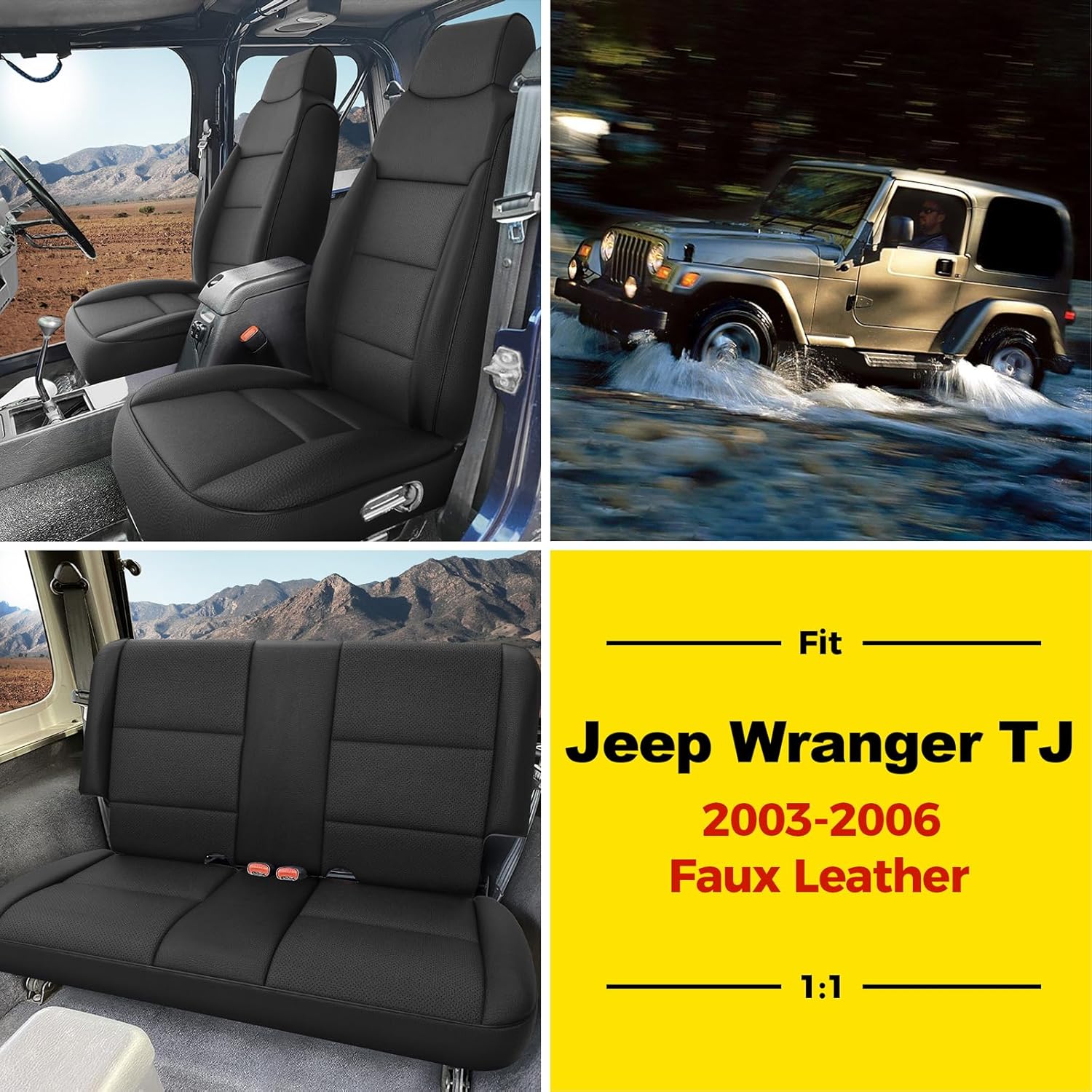 GIANT PANDA Full Set Car Seat Covers Customized Jeep Wrangler TJ Rubicon Sahara Sport X Unlimited 2003 2004 2005 2006, Faux Leather (Black)