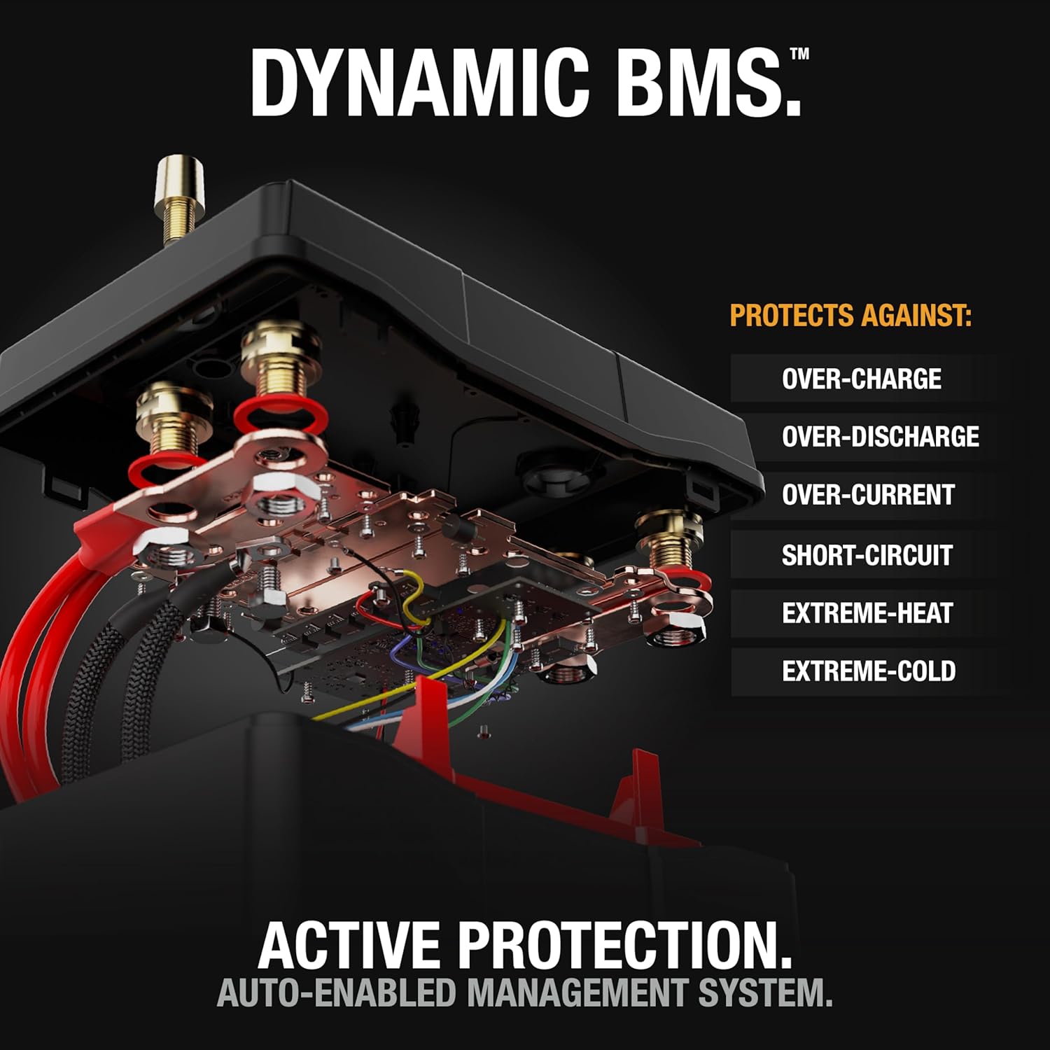 - DYNAMIC BMS — Built-in battery management system ensures safety and reliability with bidirectional cell balancing and protection from overcharge, overdischarge, short circuits, and more - plus active thermal monitoring with no resets required..