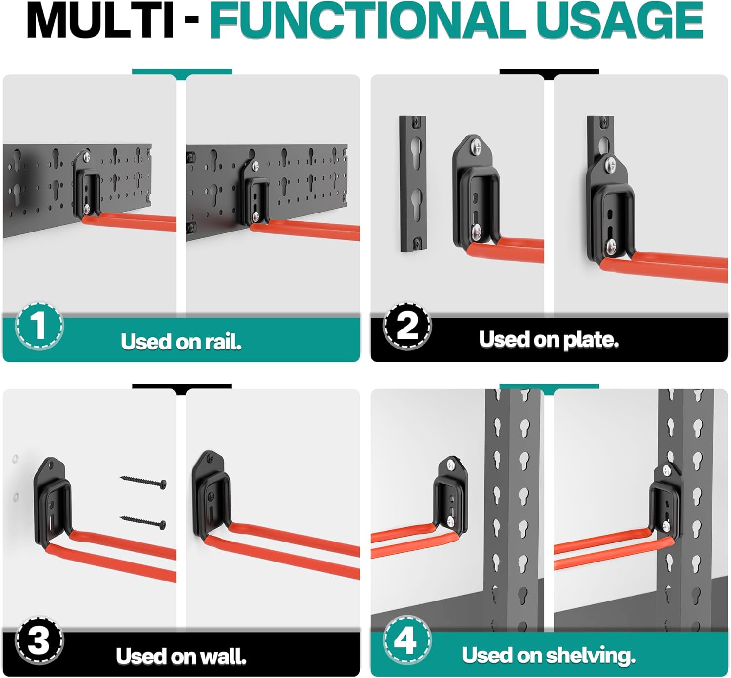 - Neat and Organized: The adjustable hooks are simple to remove and reposition to fit your changing storage needs. They snap onto the rails quickly, making it easy to store tools of all sizes on the wall and free up valuable floor space