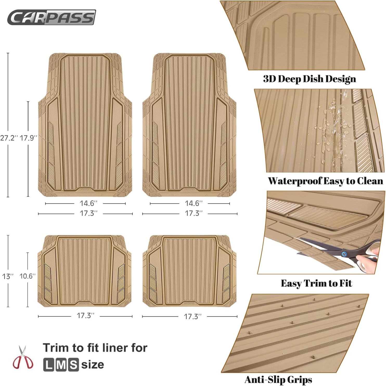 - 【All Weather All Season Protection】CAR PASS heavy duty rubber solid beige car mats use for all season.Ridge channels specifically design to prevent fluids from leaking onto carpets,the deep channels also trap any mud, dirt, water or snow that gets in your car.