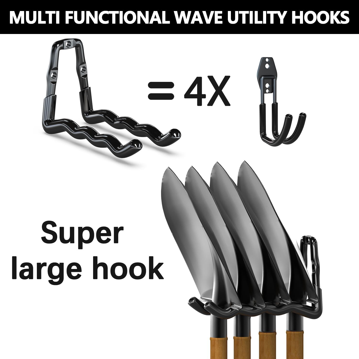 - Various Sizes Garage Wall Hooks: 4 pack tool hangers for garage wall in 2 different sizes, including 2 medium wave garage hangers and 2 storage straps. These storage hooks for hanging in garage come with steel nails and expansion pipes for easy installation, offering a solution for enhancing your garage storage system