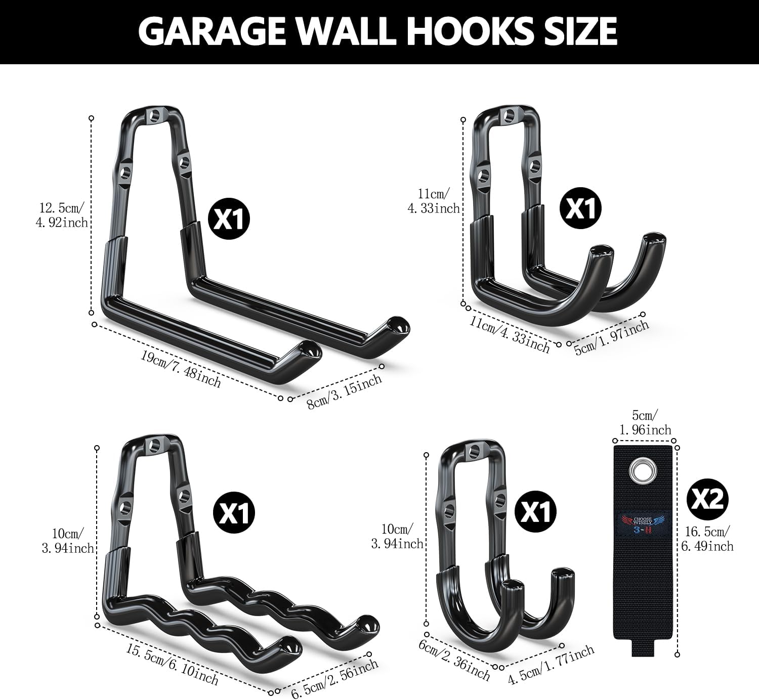 - Various Sizes Garage Wall Hooks: 6 pack tool hangers for garage wall in 5 different sizes, including 1 large hook, 1 medium wave shed hook, 1 medium J type shovel holder wall mount, 1 small j garage hanger and 2 storage straps. These storage hooks for hanging in garage come with steel nails and expansion pipes for easy installation, offering a solution for enhancing your garage storage system