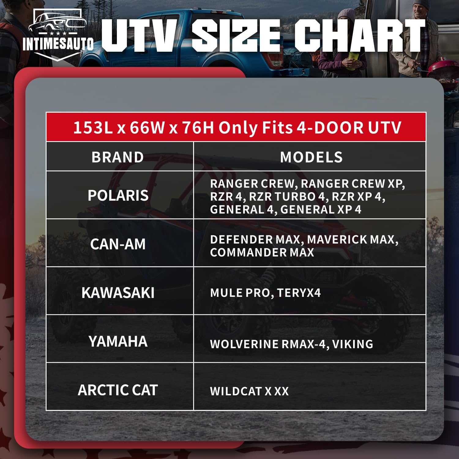 - DESIGNED FOR OUTDOOR PROTECTION: The InTimesAuto 4 wheeler cover is crafted from durable 6-layer oxford cloth with reinforced stitching, offering exceptional cover waterproof outdoor performance. This outdoor heavy duty cover provides 100% waterproof heavy duty protection, shielding your side by side UTV from dust, snow, rain, and other harsh weather conditions. Perfect for outdoor season use, it ensures secure outdoor protection and waterproof outdoor storage for most UTV models.