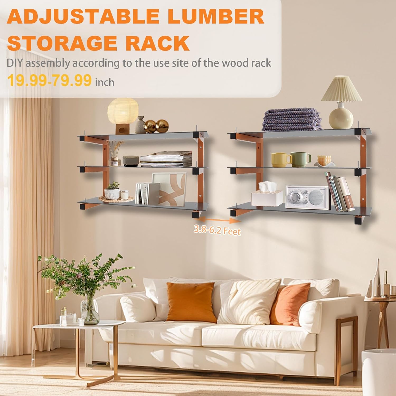 4 Pack Wall-Mounted Lumber Rack, Heavy Duty Wood Storage Racks, 6-Level System Garage Shelving, 1320 LBS Capacity Hanging Organizer Shelves, Orange Brackets Utility Metal Shelf for Indoor and Outdoor
