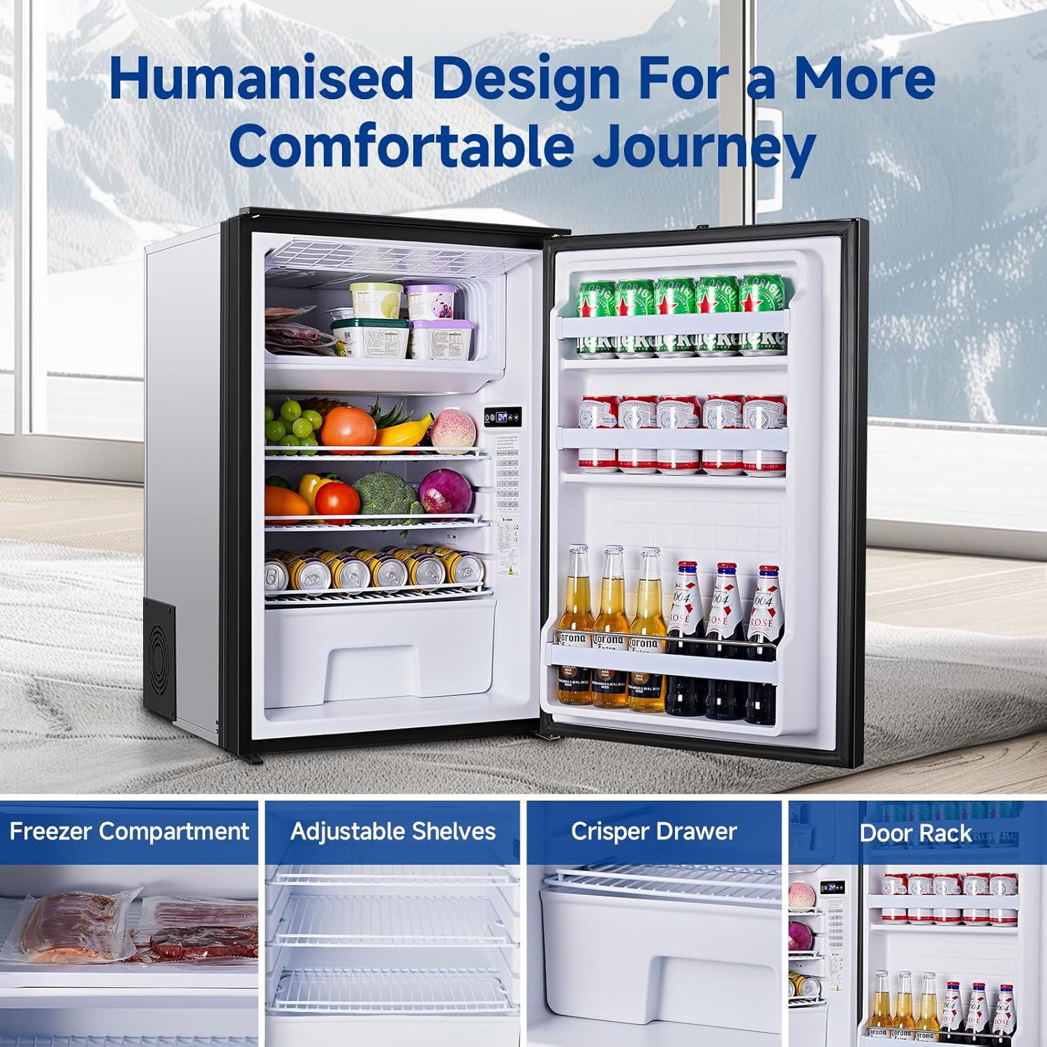 - Professional & Powerful Compressor: BODEGACOOLER RV Mini Refrigerator can be a fridge (97.2QT ) and freezer (19QT) simultaneously! It can chill down to 5°F-32℉using powerful compressor cooling technology, from refrigeration to freezing. Adjust the freezing or refrigeration range of the car refrigerator from 5℉ to 50℉ as needed. This portable refrigerator and freezer is a good choices for outdoor activities such as camping, picnics, road trips, and more. RV refrigerator to accompany you on your journey