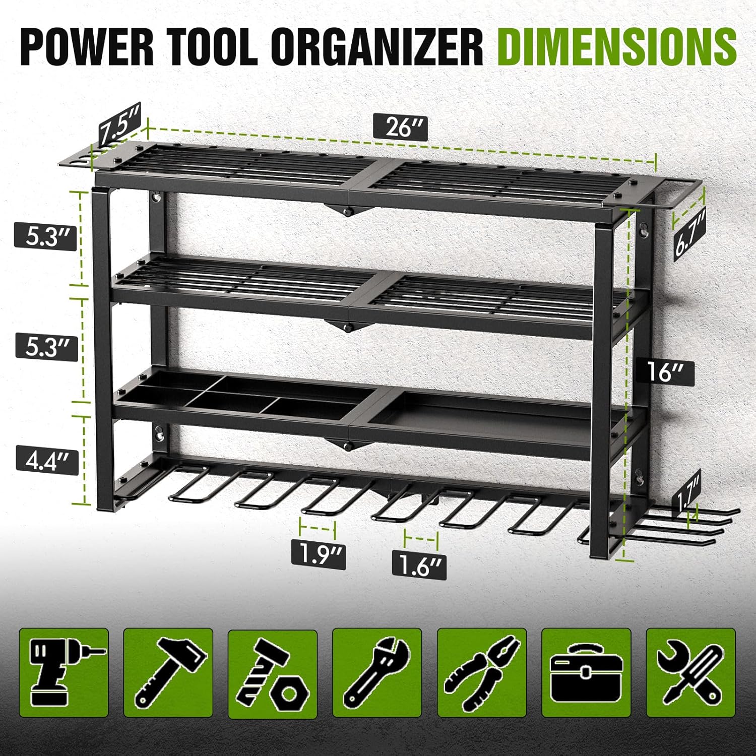 - 4 TIER HIGH CAPACITY STORAGE: Our power tool organizer comes with 4 shelves to store up to 9 drills. The upper three tiers can store a variety of tools, including a well-designed screw organizer on the third tier, which can also hold other large tools