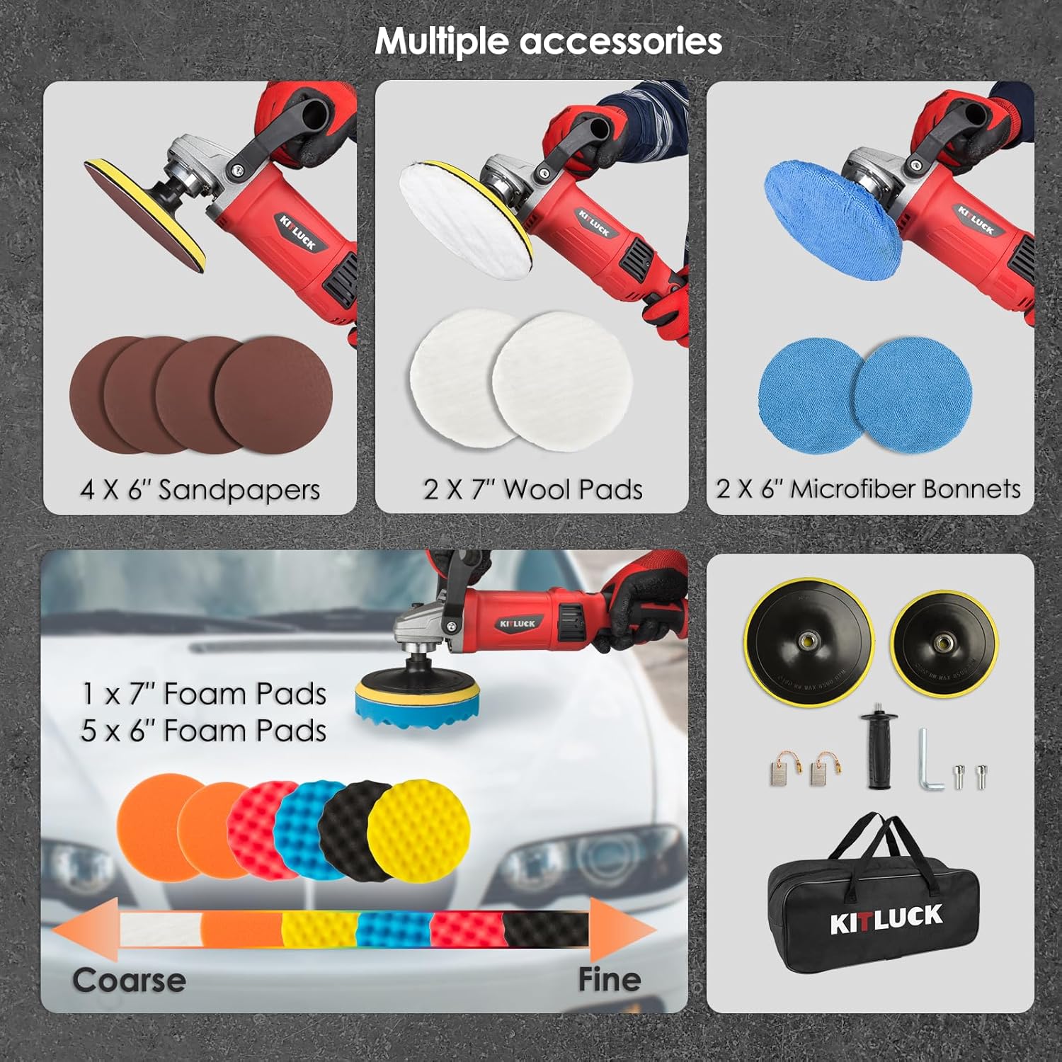 - Included Components : 1 * KITLUCK Car Buffer Polisher Machine, 2* 7-inch Wool Polishing Pad, 2* Microfiber Bonnets,4*Sandpapers, 5* 6-inch Foam pads,1* 7-Inch Foam pads, 6&7 inch Hook And Loop Base Pad 1 * KITLUCK Car Buffer Polisher Machine, 2* 7-inch Wool Polishing Pad, 2* Microfiber Bonnets,4*Sandpapers, 5* 6-inch Foam pads,1* 7-Inch Foam pads, 6&7 inch Hook And Loop Base Pad