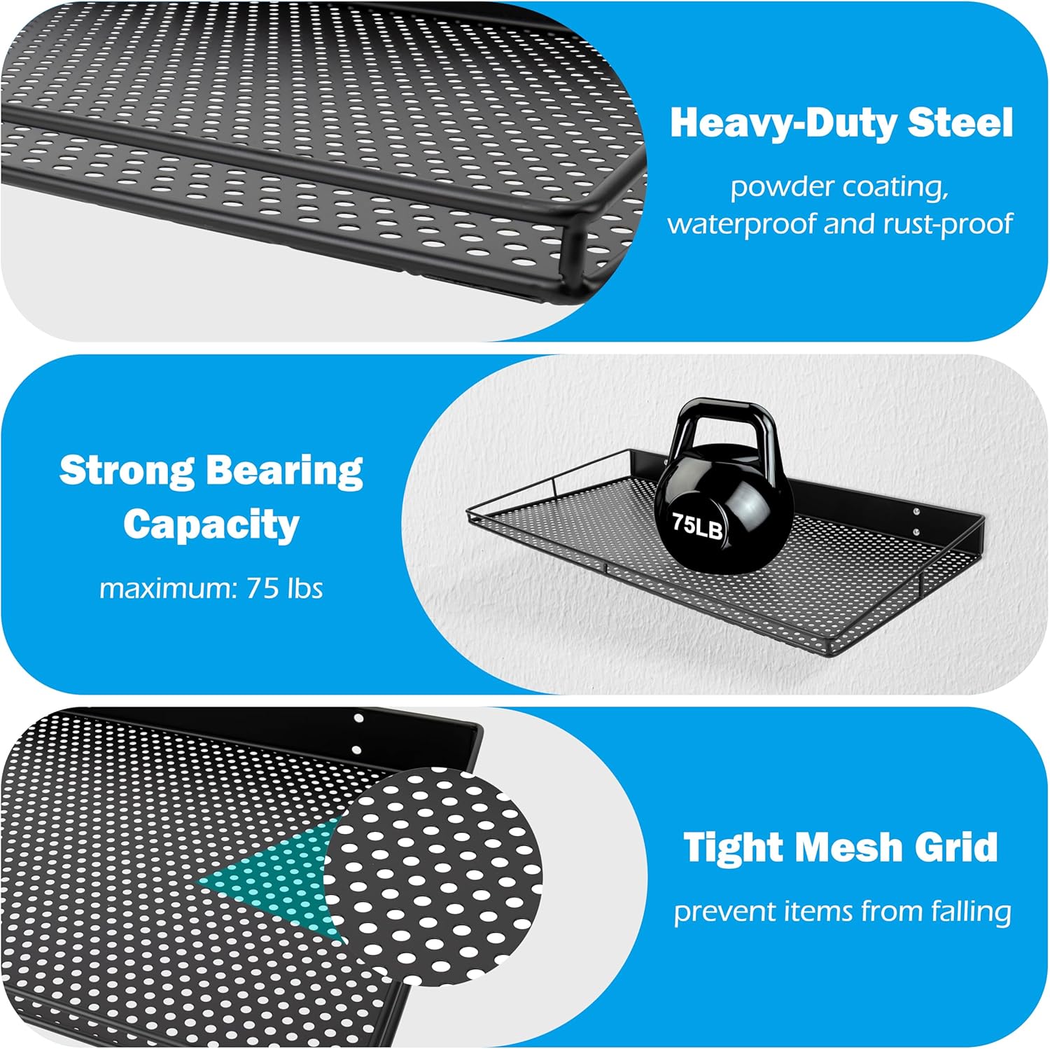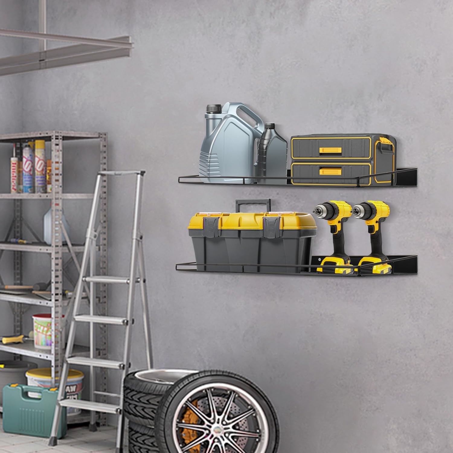 - Space Saving: The wall mounted shelves make full use of wall space to improve space utilization. Free up the floor area and bring order to a cluttered garage. The maximum load capacity can reach 75 lbs to fully meet the needs of daily use.
