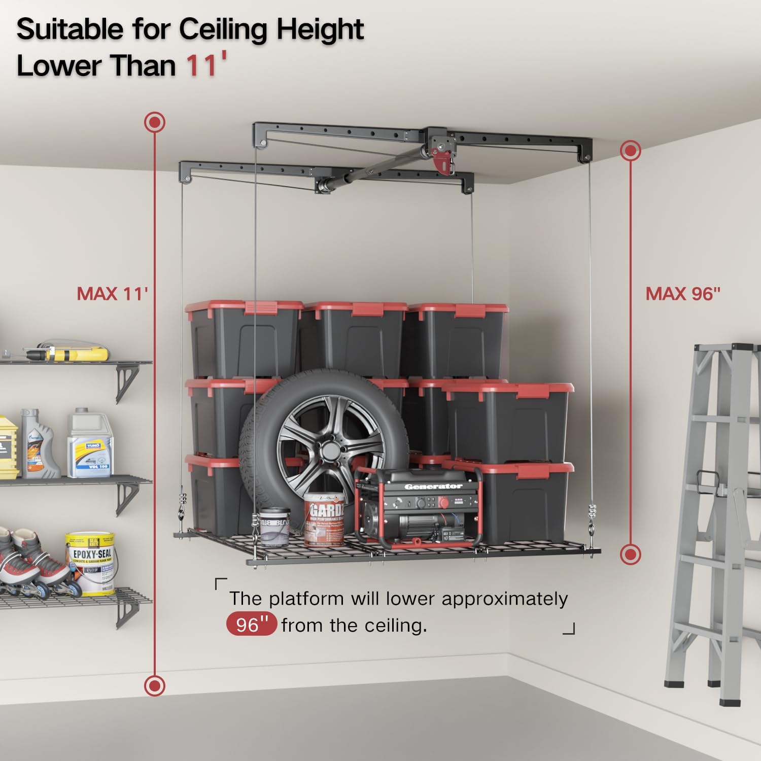- Maximize Garage Storage Space & Height Compatibility: Get 16 sq feet of additional overhead storage space with our garage hanging storage rack. Suitable for ceilings up to 8-11 FT high, and the platform can be lowered approximately 96 inches (8 FT) from the ceiling, making it ideal for both low and high garage spaces. Perfect for those who need extra shelving but don’t have the floor space.