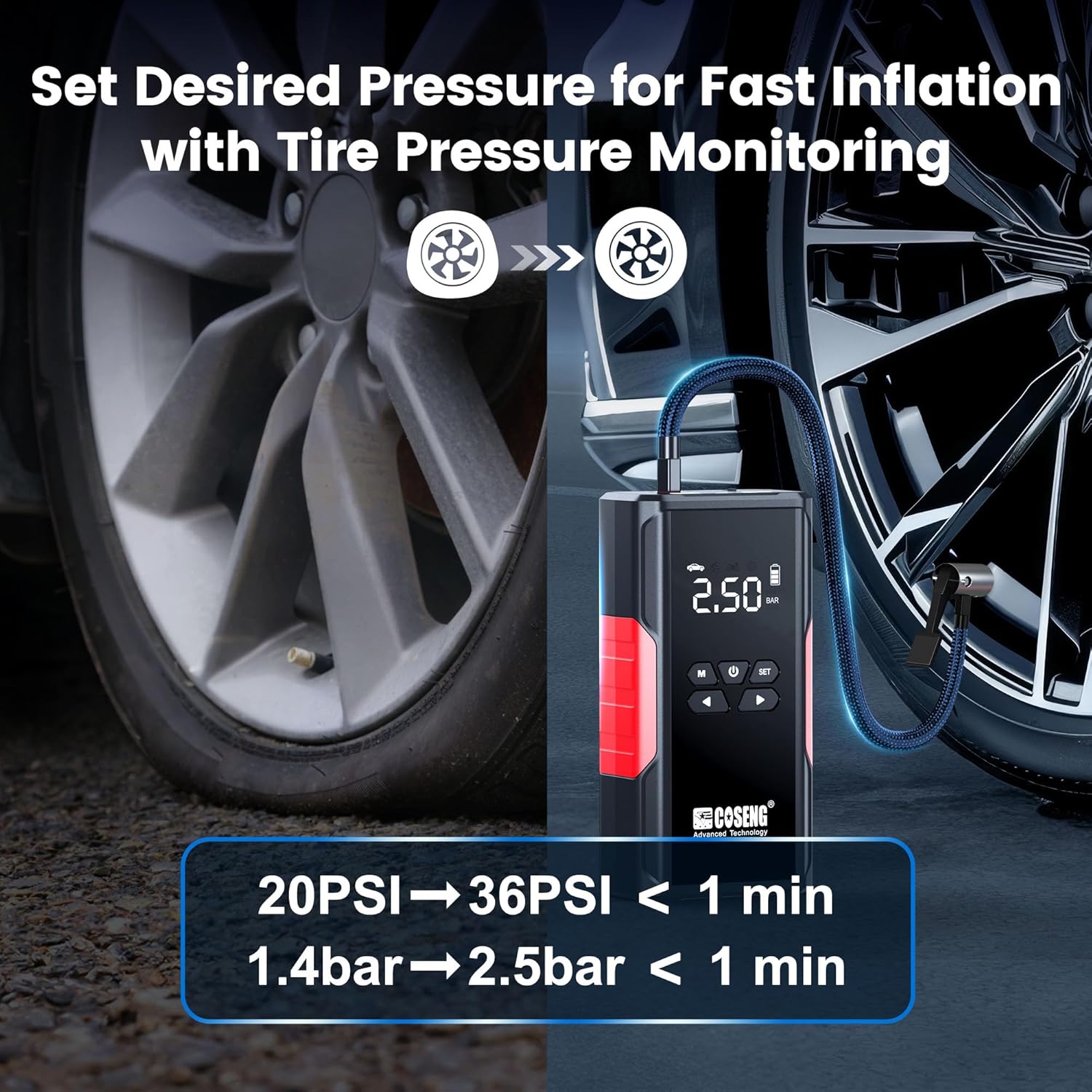 - POWERFUL PORTABLE JUMP STARTER: Reliably jumpstart 12V batteries for cars, trucks, motorcycles, lawnmowers, SUVs, snowmobiles, boats, and more—even in extreme temperatures (-4°F to 140°F). With a high-performance 10,000mAh lithium battery capable of 2000+ charge cycles, the Coseng J26 supports up to 6.0L diesel and all gasoline engines, ensuring dependable power for every emergency.