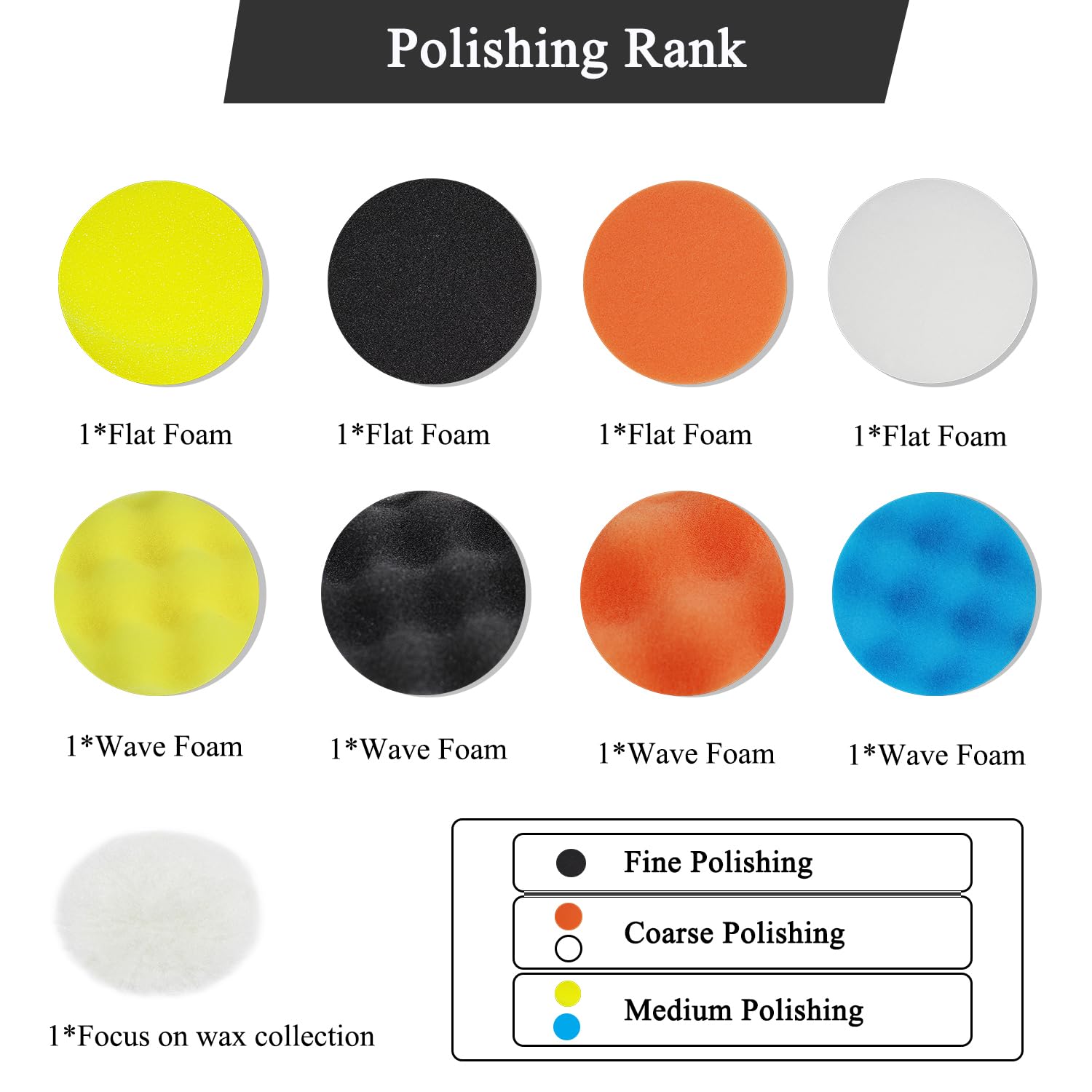 - Car Polishing Buffing Kit,11 Pcs Car Foam Polishing Pads Kit,8 pcs 3" Sponge Polishing Pads, 1 pcs Wool Buffing Pad,1 pcs Drill Adapter,1 pcs Suction Cup