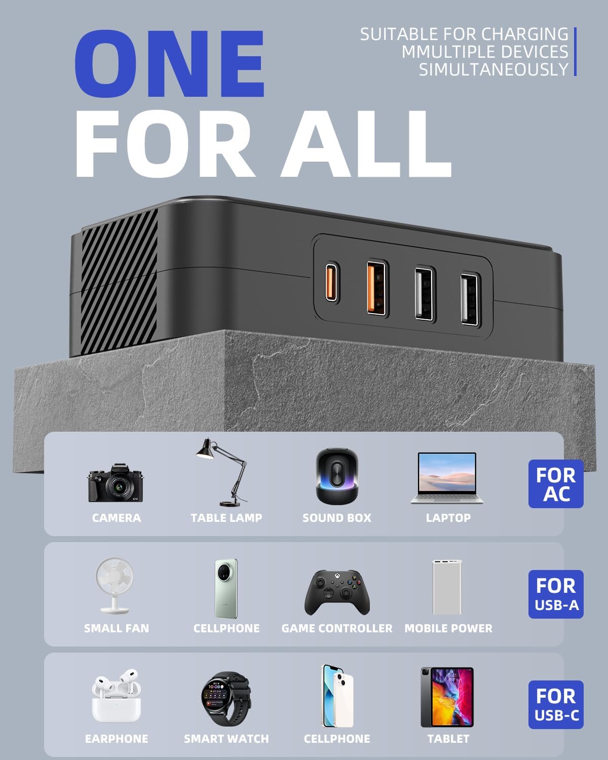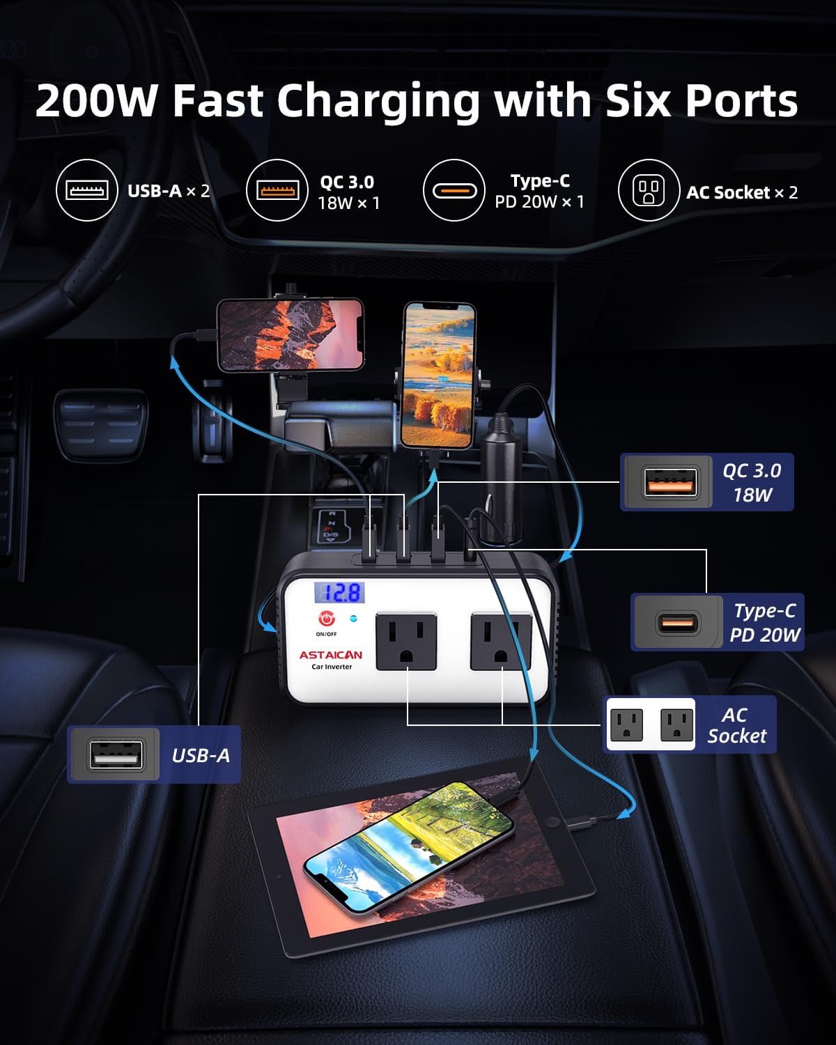 - 【Astaican 200W Car Power Inverter】The 6 in 1 car inverter can convert 12V DC to 110V AC power, equipped with PD 20W USB-C and 18W USB QC port, dual USB ports and AC outlet. One car charger for most your USB A & USB C devices, compatible with Phone, laptop, power bank, smart watch, tablet, lights