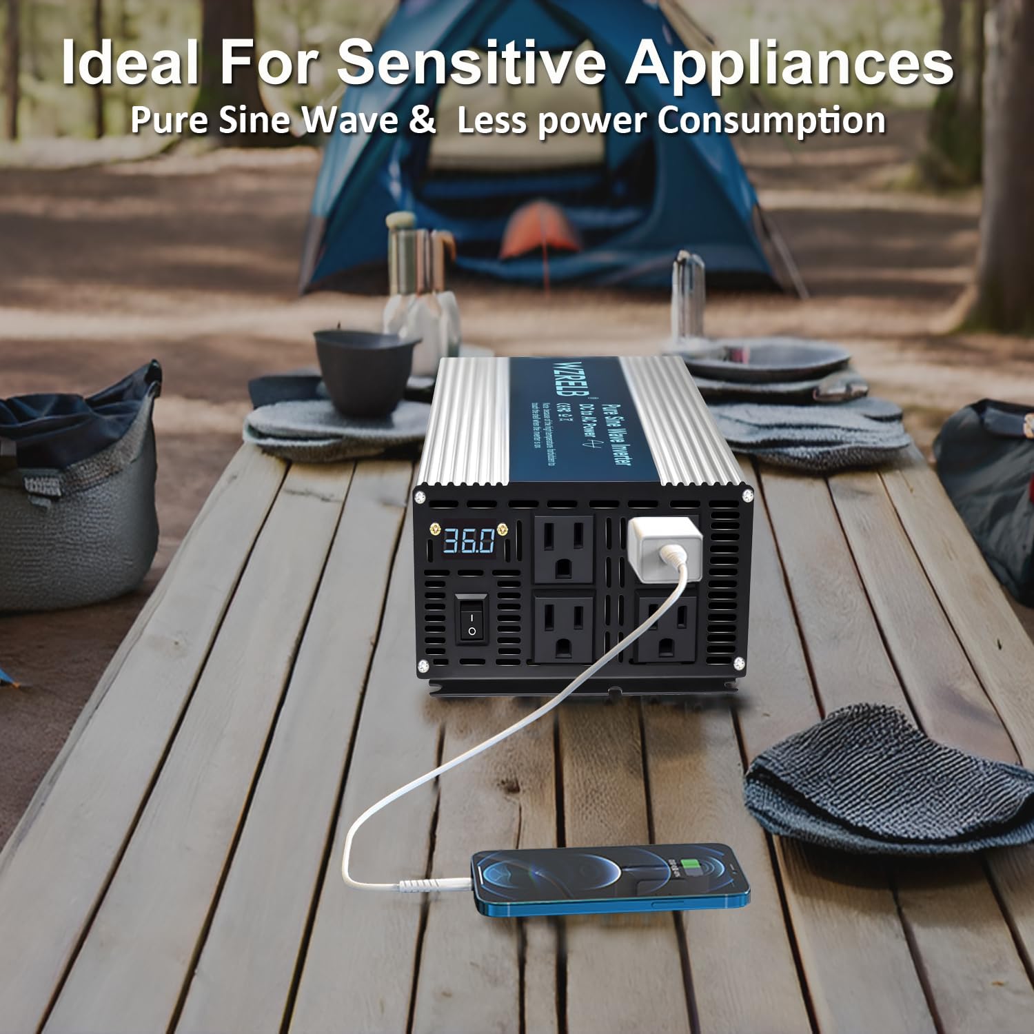 WZRELB 1800W Pure Sine Wave Inverter 36V DC to 110V 120V AC,Car Power Inverter with 4 AC Outlets, LED Display,Off-Grid Portable Power Converter for Home, RV, Truck, Camping